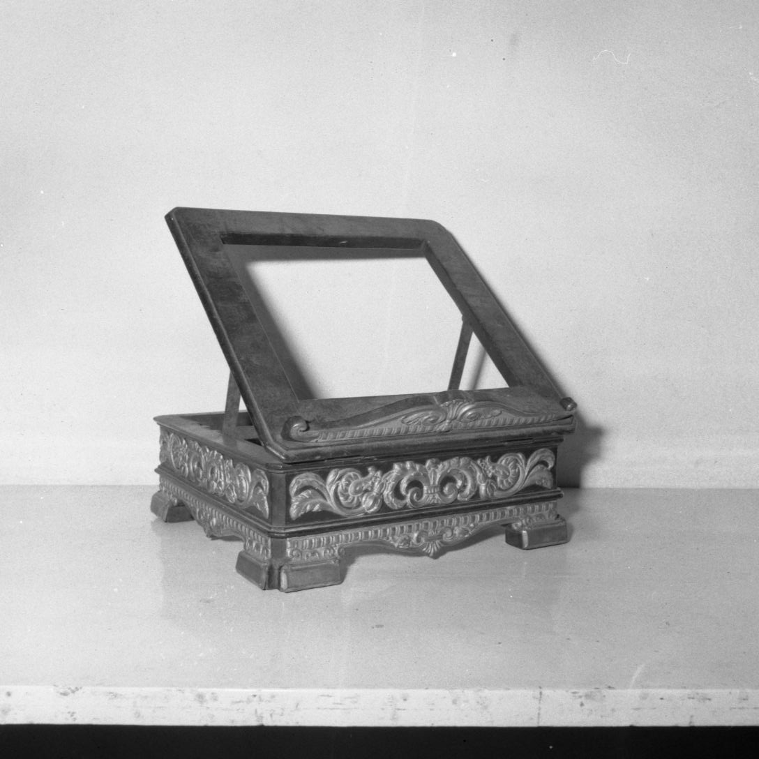 Leggio in legno nero. Di forma rettangolare, con spigoli smussati, su quattro peducci ad angolo retto coperti da lastra d'argento liscia e raccordati da motivo in lastra sbalzata a volutine con foglietta centrale. La fascia è decorata, sui quattro lati, da lastra sbalzata secondo un motivo a girale di foglie con fiore nelle volute terminali. Alla base dell'alzata una piccola cimasa a doppia voluta raccordata al centro da palmetta
