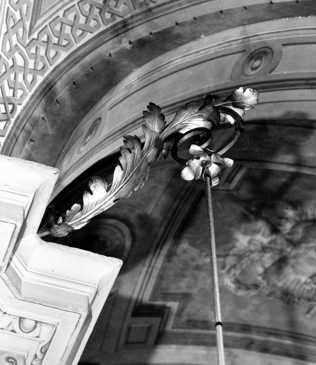 Il braccio è formato da una robusta voluta in ferro battuto di sezione quadrata sulla quale è applicata una lunga foglia polilobata in lamina di stagno. Alla voluta è appeso un fiore quadripetalo in lamina di stagno dal quale pende il sostegno della lampada pensile