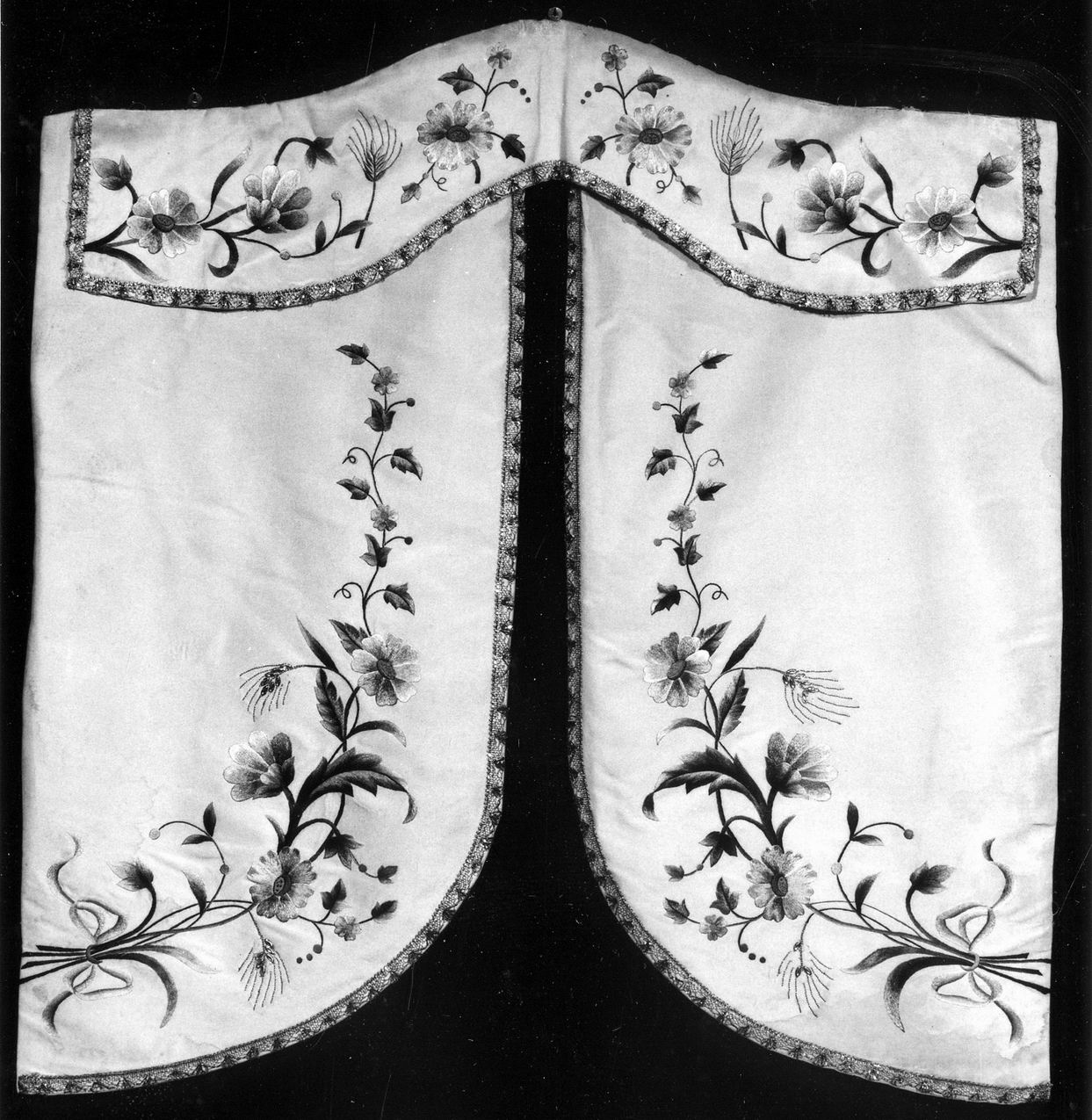 Il conopeo, suddiviso in due bande con l'angolo interno smussato e arrotondato, presenta nel lato superiore ad andamento curvilineo una bandinella con fiori policromi e spighe disposti orizzontalmente. Lo stesso motivo di fiori intrecciati (in questo caso annodati da un nastro) sale lungo la scontornatura delle due bandinelle. Il tessuto è in seta gros color bianco