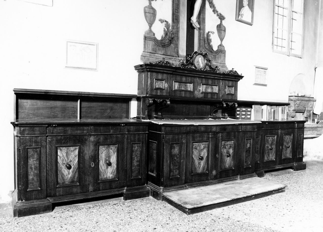- NOTIZIE STORICO CRITICHE Fanno parte di un arredo composto da grandi mobili di gusto severo e di bel disegno. Non pare accettabile l'opinione del Raule che queste opere possano essere riferite all'autore degli stalli del coro, dato che si tratta di arredo ligneo sostitutivo di quello quattrocentesco, andato perduto nel secolo XVIII (1771). La sobria e massiccia struttura dei mobili è alleggerita dal contrasto delle tonalità dei legni e dagli eleganti motivi decorativi delle finiture e dei particolari
