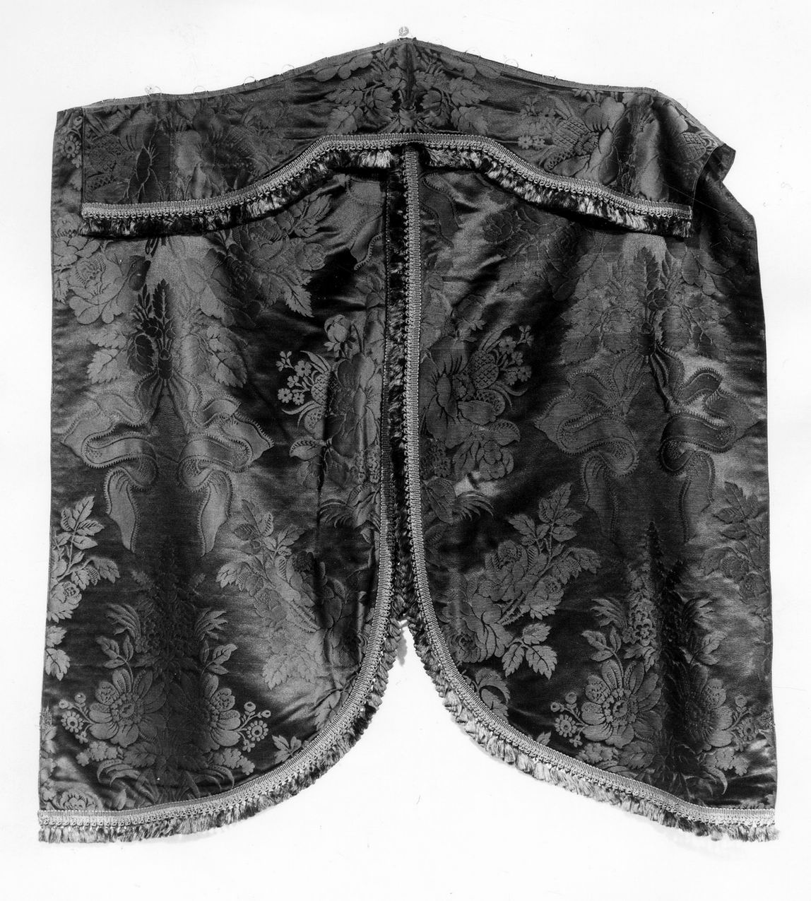 Tessuto di colore viola vivo tendente al blu, operato a mazzi di rose legati da nastri e alternati a mazzi di fiori vari; bordo e frangia di seta viola