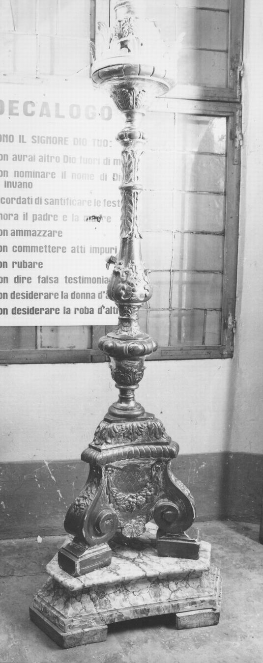 La base troncopiramidale su peducci quadrangolari è collocata su uno zoccolo dipinto in finto marmo. Festoni di foglie e fiori ornano gli spigoli e le facce della base. Stelo a vaso terminante con una fascia di grossi baccelli e a birillo. Gocciolatoio piatto