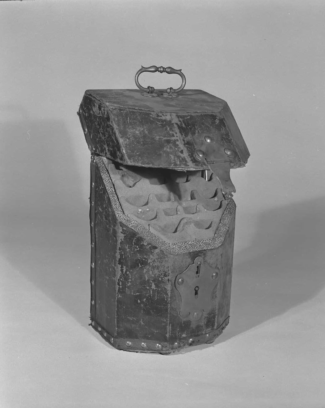 A cofano, con faccia posteriore quadrangolare liscia e parte anteriore sagomata in aggetto pentagonale. All'interno è foderato in carta stampata e presenta vani, a scalare, per un servizio per sei persone. Coperchio con presa a maniglia in bronzo, serramenta in bronzo, fascia inferiore e margini verticali esterni con borchie in bronzo