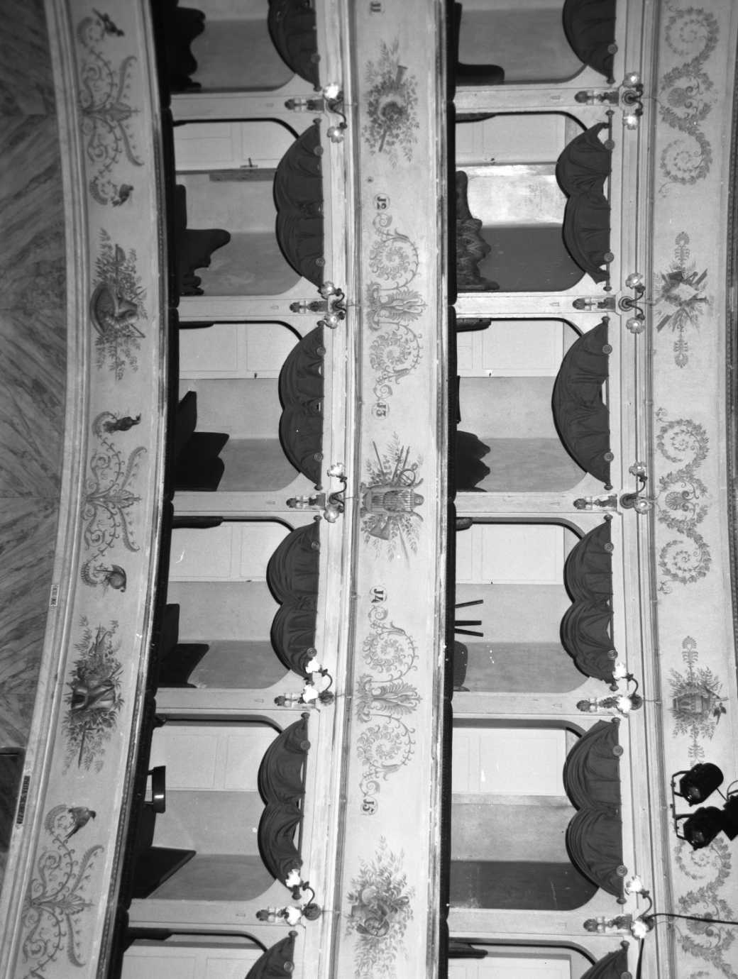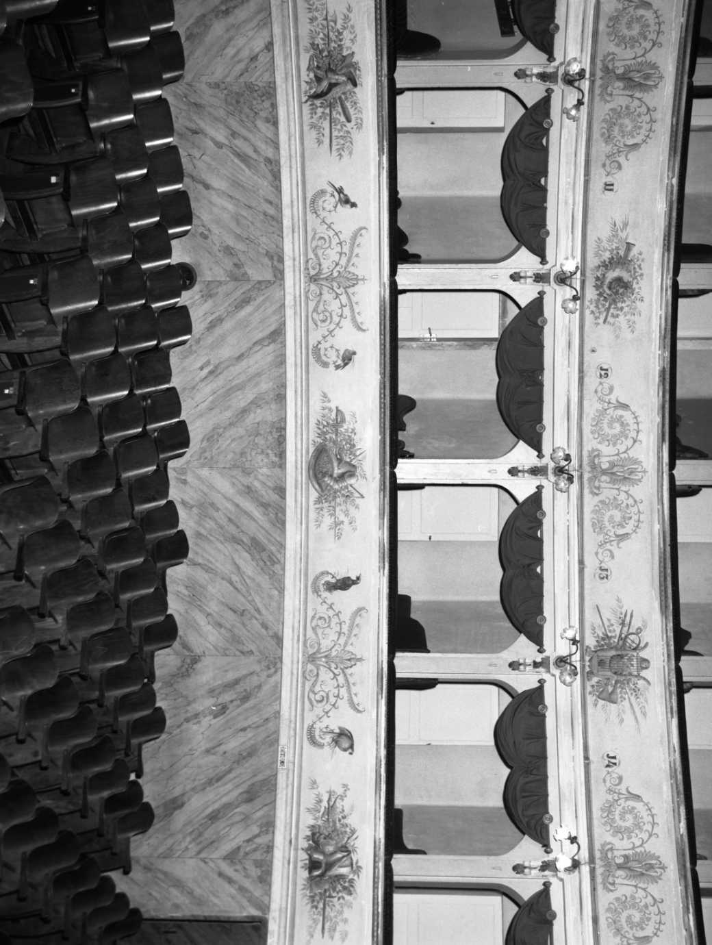 - NOTIZIE STORICO CRITICHE La decorazione di queste fasce si intona al soggetto della pittura della volta ed intende celebrare le arti e le scienze. Appare di elegante fattura ed è ascrivibile, per lo meno come ideazione, a Francesco Migliari, il pittore ferrarese autore anche dell'affresco della volta