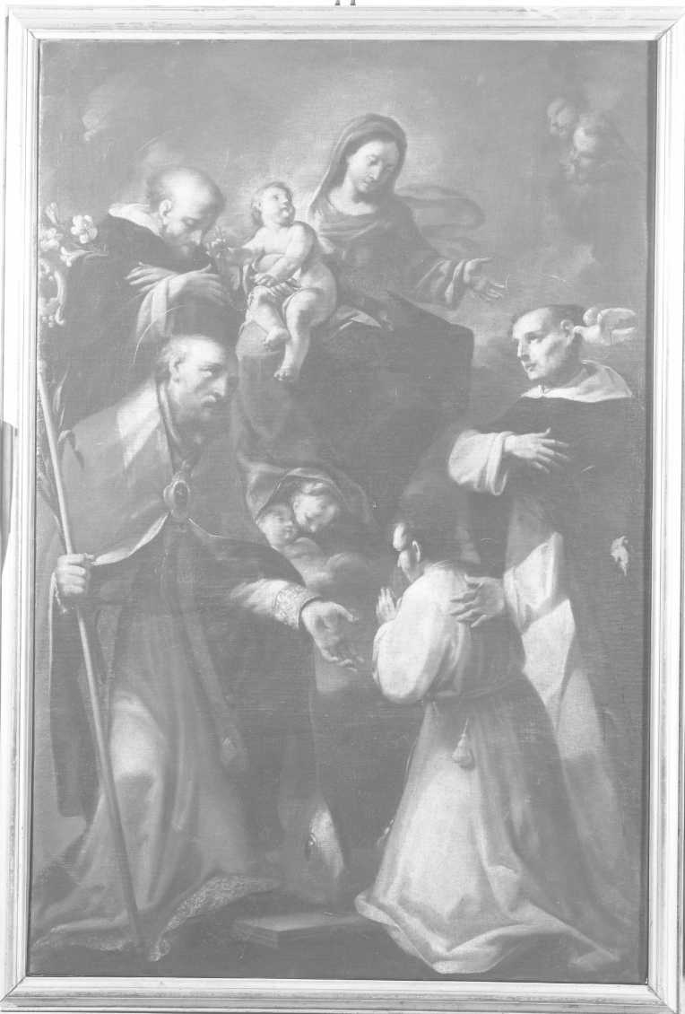 In alto la Madonna con in braccio il Bambino in atto di sorreggere il rosario. Alla sua sinistra San Giuseppe vestito in abito domenicano. Al centro in basso un giovane levita presentato alla Vergine da SAn Tommaso di Canterbury e da San Giacomo Apostolo