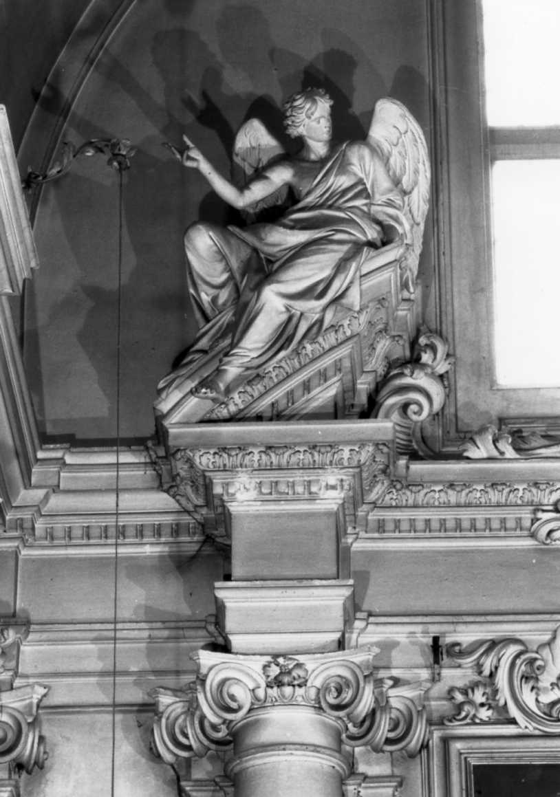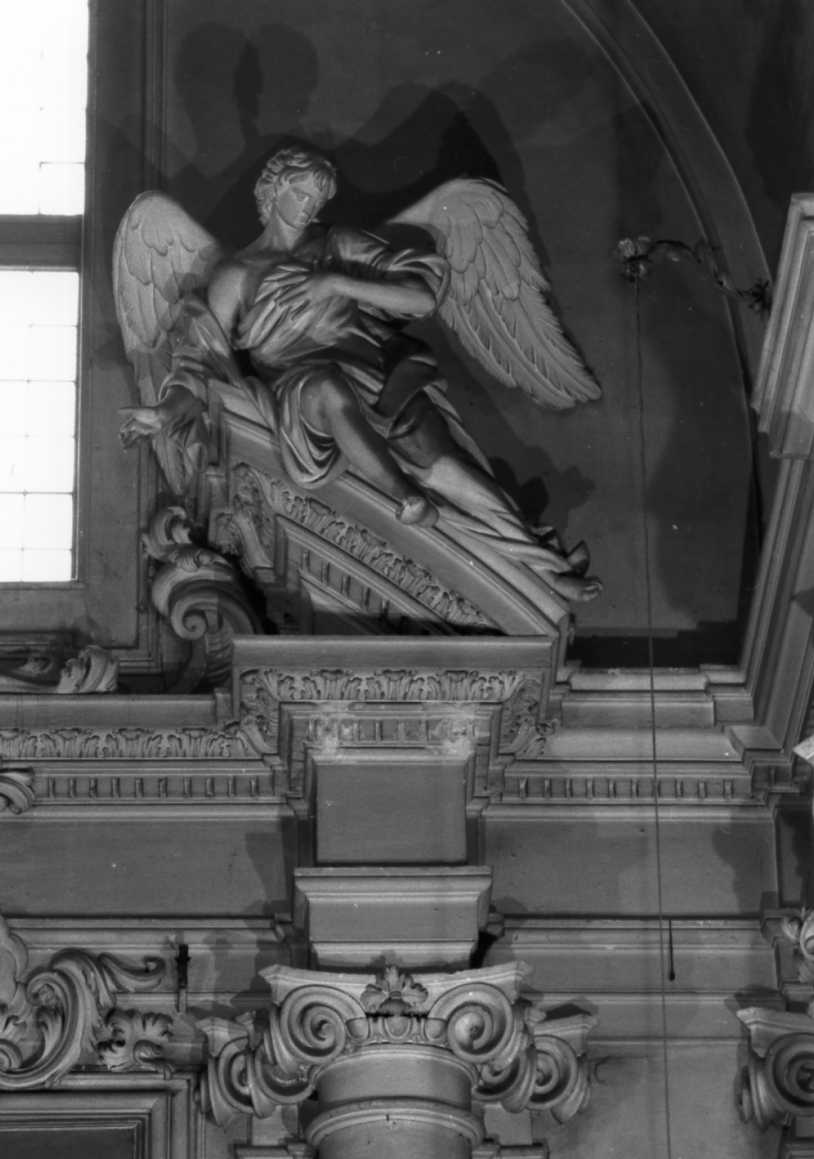 I due angeli, a tutto tondo, sono seduti in posizione speculare sopra le due estremità del frontone spezzato con la gamba desra sospesa nel vuoto; hanno grandi ali, capelli mossi, la mano destra avanzata