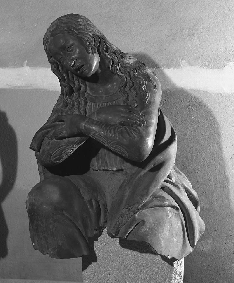 Resta mezza figura, già inginocchiata, in veste drappeggiata allo scollo e alle maniche, con manto panneggiato. Il capo, con lunghi e mossi capelli, spartiti al centro, è reclinato verso la spalla destra, la bocca è aperta; le braccia sono incrociate sul petto. Poggia su un basamneto moderno