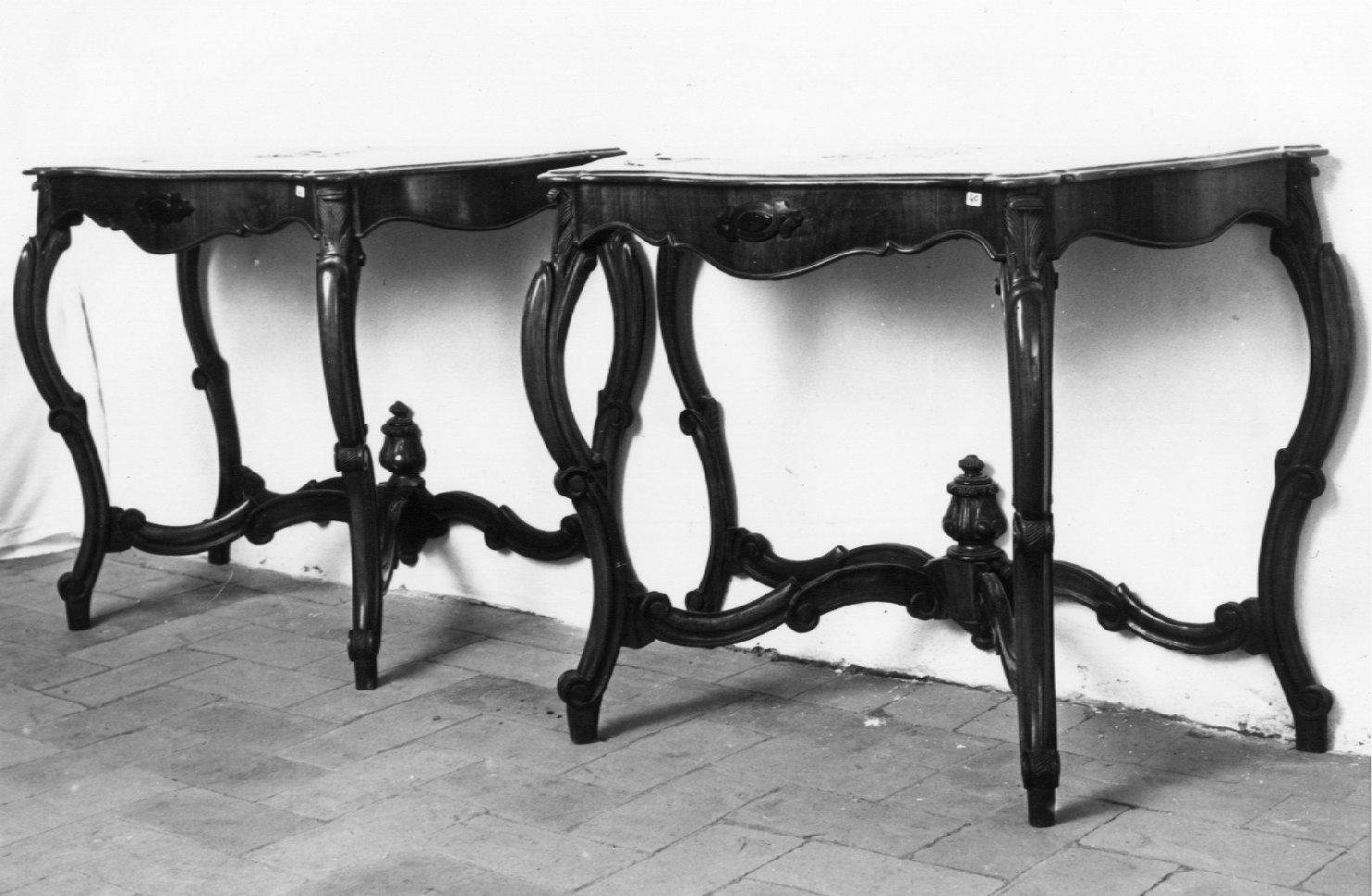 Sono a disegno tutto mosso, iin pianta, nelle fascie, e nei sostegni legati al basso da traversi facenti capo al centro ad un bocciolo. Lucidati in bruno