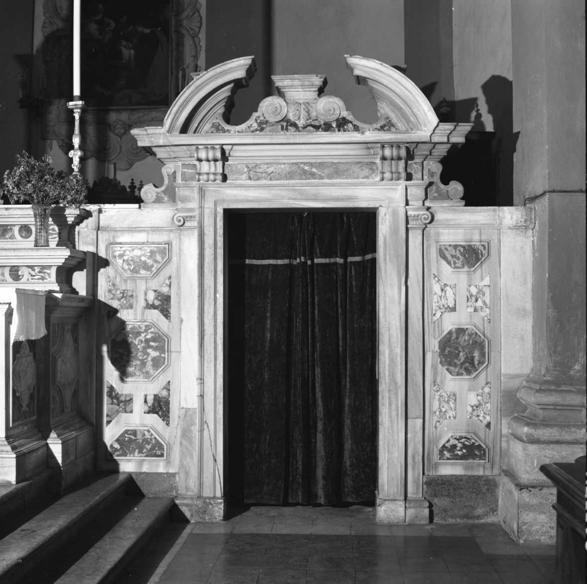 In continuazione dell'abside e fra questo e il pilastro dell'abside vi è una parete marmorea con un portale barocco. Uniscono l'una con l'altro le due fette di un pilastrino con capitello ionico e due mensole a volute. I due tratti di parete sono di greco, con formelle semplicemente intarsiate o anche incorniciate, a disegni geometrici, di rosso di Francia, occhio di pavone e pavonazzetto. Stipiti e architrave sono di greco, come il frontone e timpano che sormonta nella parte superiore. E' questo curvo e spezzato, sostenuto da un fregio di un marmo fiorito e da due mensole a volute
