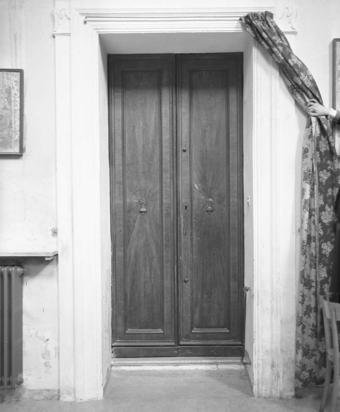 Porte a due battenti con ante ad unica specchiatura, impiallacciate a raggera e delimitate da cornicette modanate; al centro di ogni anta è fissato un battaglio pendente fusiforme