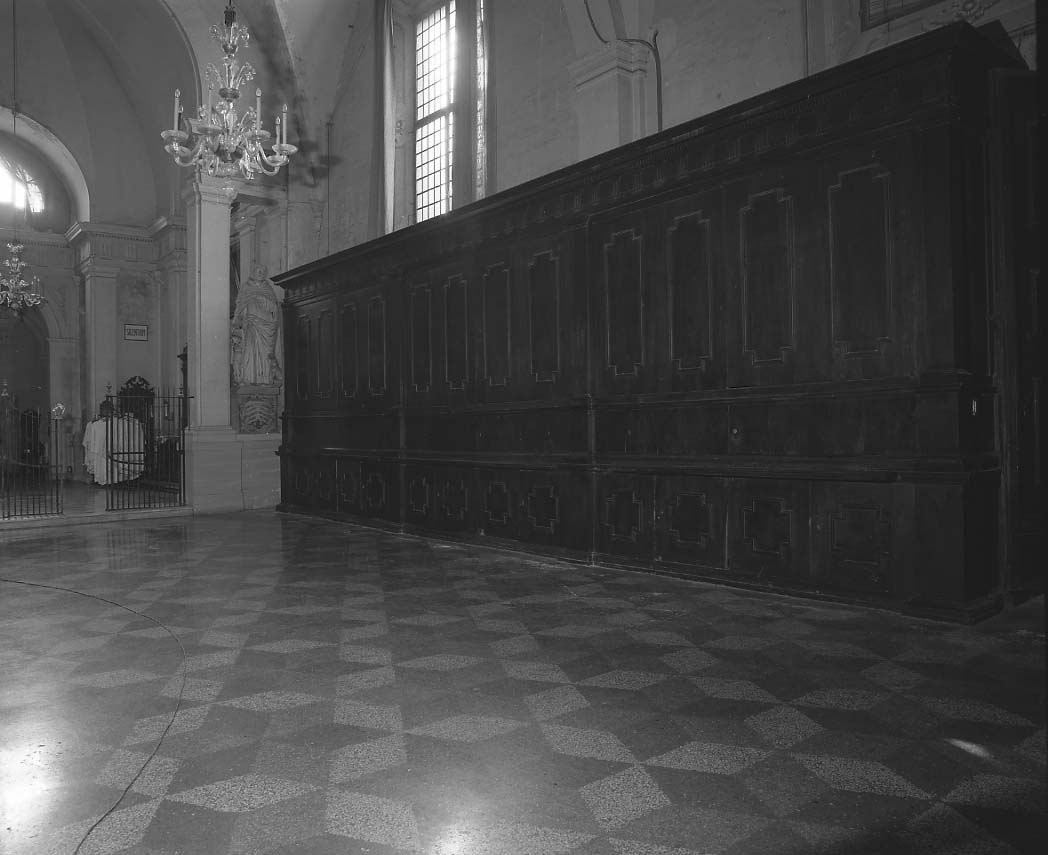 - NOTIZIE STORICO CRITICHE Uno dei due armadi, citato nei documenti come "quel armadio grande di noce che sta in sacrestia, fu fatto eseguire da Giuseppe Pasqualini, sacrestano di San Domenico per più di 34 anni, negli anni quaranta del Seicento. A lui si deve anche la Madonna del Conventi sulla colonna posta nella piazza e fatta erigere nel 1632. Si tratta dell'armadio posto lungo la parete di destra entrando in sagrestia. L'armadio collocato lungo la parete opposta fu, invece, fatto costruire simile a quello seicentesco nel Settecento, dopo i lavori di restauro della chiesa condotti dal Dotti e dopo i lavori che hanno interessato la struttura della sagrestia: i disegni del Dotti, infatti, mostrano che al tempo della ristrutturazione della chiesa (1727-1732) la parete di sinistra non esisteva. Marescalchi ricorda entrambi gli armadi e, in particolare, "quello alla sinistra, opera di fra' Francesco Antonio Cossetti da Vicenza converso domenicano verso l'anno 1744". Cossetti restaurò nel 1744 il coro e la sua porta che nel 1748 fu adattata alla sagrestia con l'aggiunta di un riquadro in basso. Alfonsi, invece, riporta che entrambi gli armadi furono eseguiti da Lodovico Amadori nel 1605