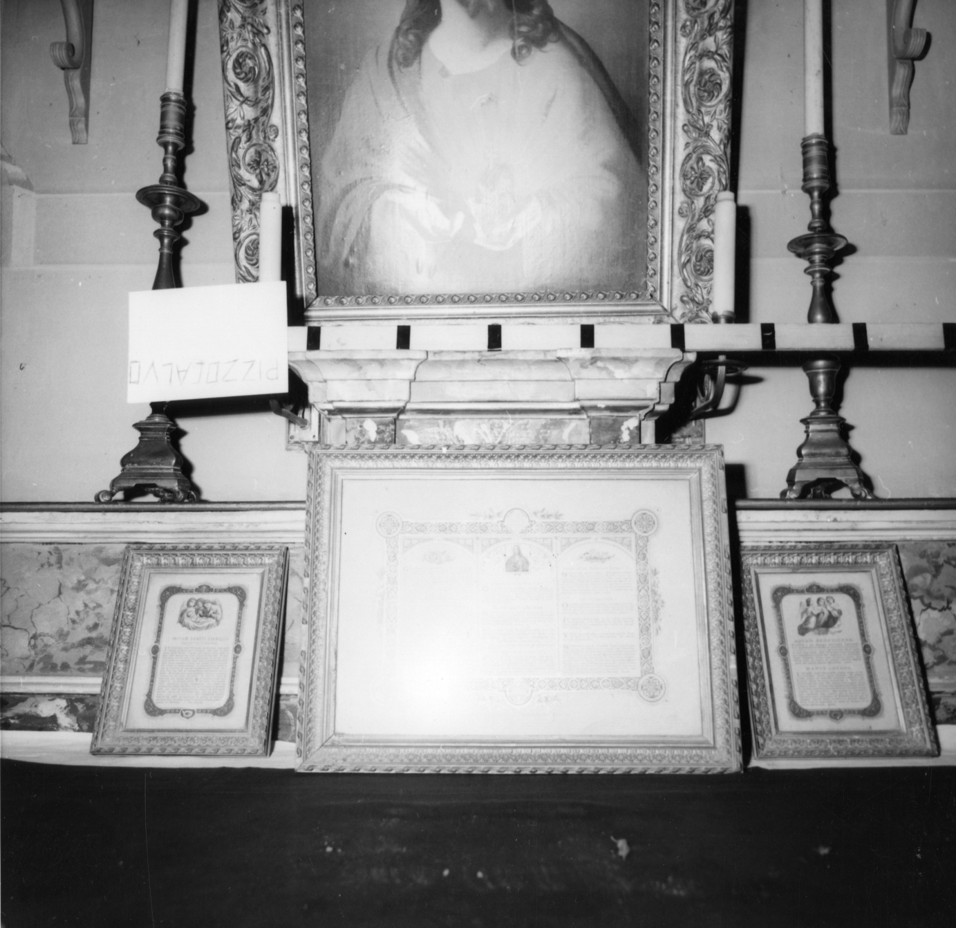 Le cornici sono in legno laminato d'oro decorato con corone di foglie d'acanto nello sguscio. Una contiene l'Inintium Sancti Evangelii secundum Joannem, e in alto una stampa riproducente Gesù Bambino fra tre angeli. L'altra Acquam Benedicens e Manus lavans, e in alto tre angeli con le mani giunte