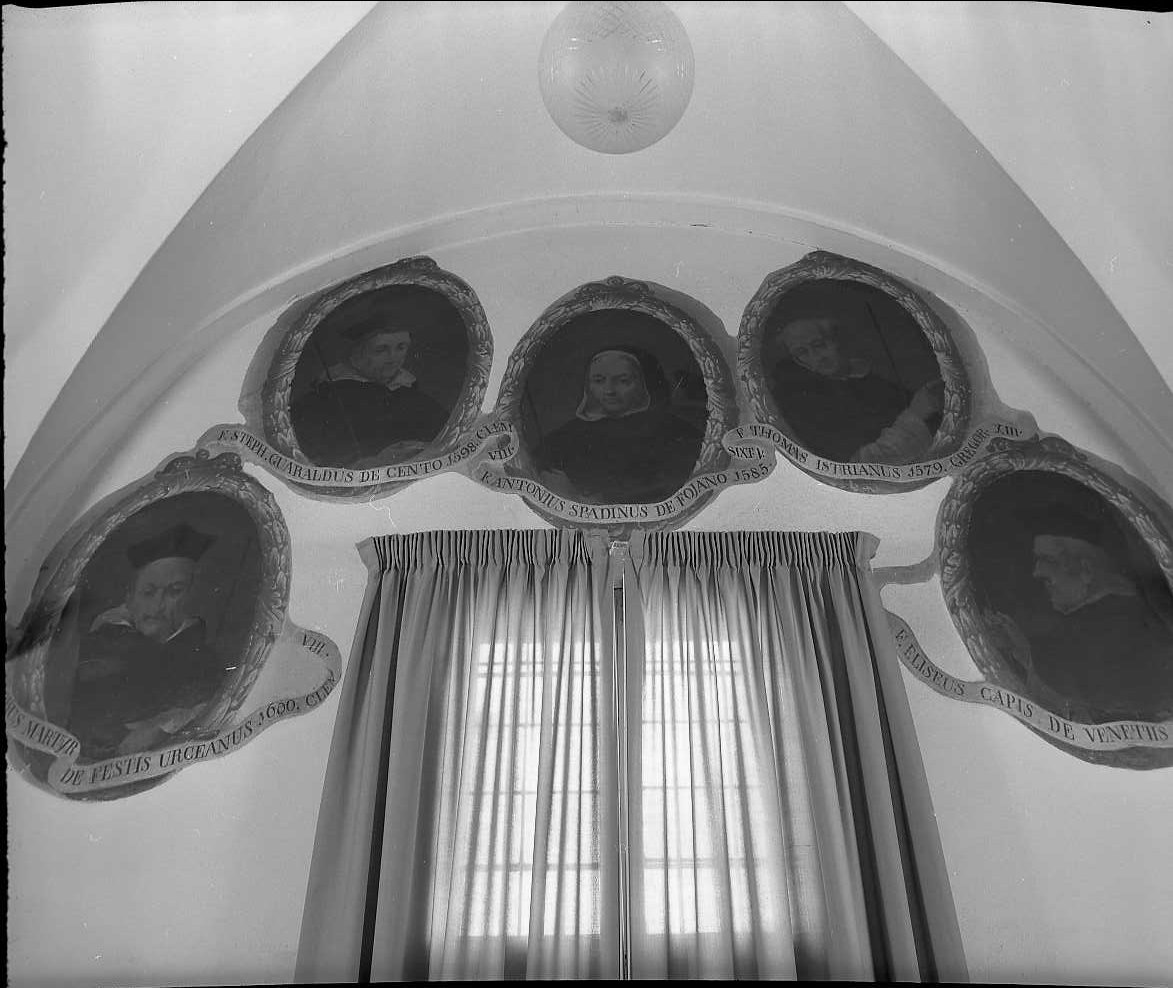 - NOTIZIE STORICO CRITICHE Nella terza lunetta della parete sinistra sono rappresentati i ritratti di: fra' Eliseo Capys da Venezia, inquisitore nel 1578; fra' Tommaso Istriaini, in carica dal 1579; fra' Giovanni Antonio Spadini, in carica nel 1585; fra' Stefano Guaraldi da Cento, in carica dal 1598; fra' Pietro martire Festa da Orzi, inquisitore dal 1600