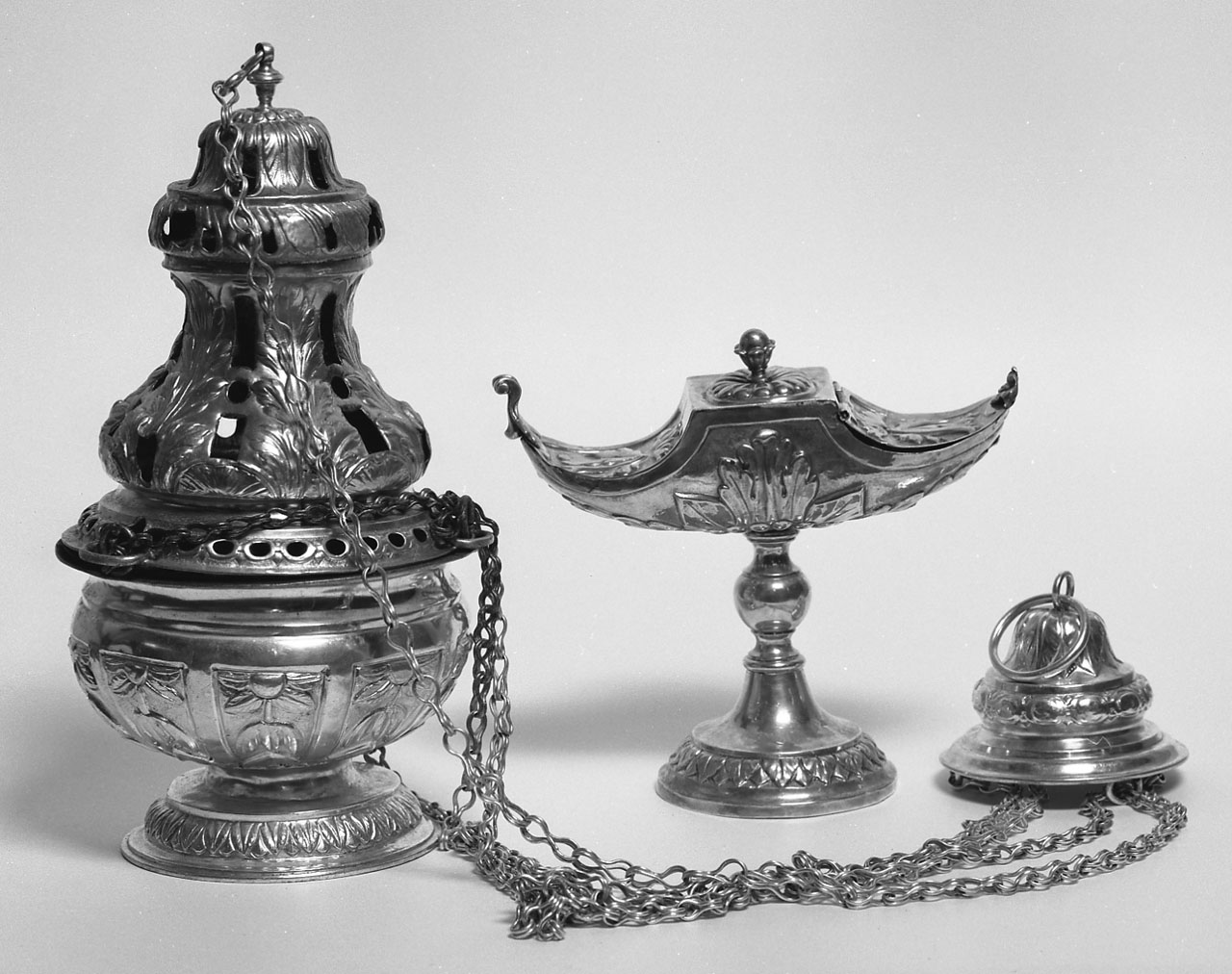 Navicella portaincenso. Base rotonda a orlo alto con giro di palmette appuntite sul dosso del piede scarsamente bombato. Impugnatura a piccolo pomo tornito e liscio. Corpo della nave nascente da giro di baccelli, decorato a grandi acanti sbalzati, con profilatura sotto l'orlo. Coperchi a fondo puntinato e decoro a foglia d'acanto