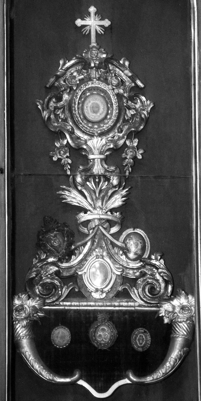 A ostensorio, su piede a doppia voluta affrontata e raccordata da scudetto dorato. Impugnatura strozzata con due palme incrociate entro corona. Teca ovale con cornicetta lignea, racchiusa entro decorazione a volute con acanti e cornici spezzate, con fiori e corolle a festone doratoe croce terminale a bracci trilobati su testina alata. In basso, sotto la base del reliquiario, sono collocate due cornucopie in legno intagliato e dorato, con uscita di fiori e foglie
