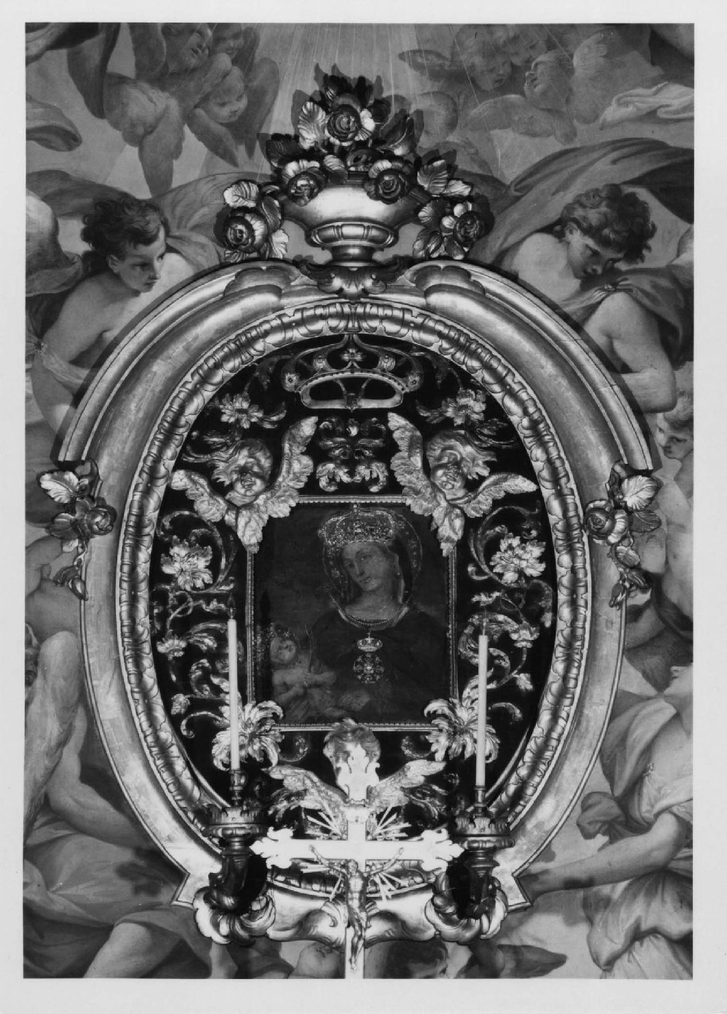 Sul fondo ovale di velluto rosso si snoda in verticale un tralcio fitomorfo a girale, uscente in foglie, fiori e boccioli. Affianca il dipinto della Madonna col Bambino, rettangolare, con stretta cornice a labbretto, sui cui angoli superiori poggiano due testine di cherubini a forte aggetto, con ali spiegate; una terza testina si ripete in basso. Tra gli angioletti superiori, un fregio a foglie affrontate è sovrastato da corona dalla quale escono lateralmente due fiori. Il complesso è racchiuso da cornice lignea ovale con battuta interna a fregi, larga fascia concava e liscia, cornice spezzata in alto, dove poggia un grande vaso con cinque rose, dorato; ai lati si affacciano altre rose, in basso, due corolle ove si innestano due candelieri