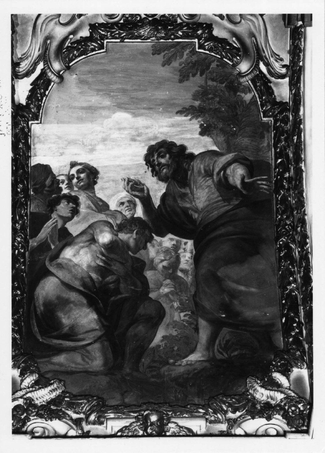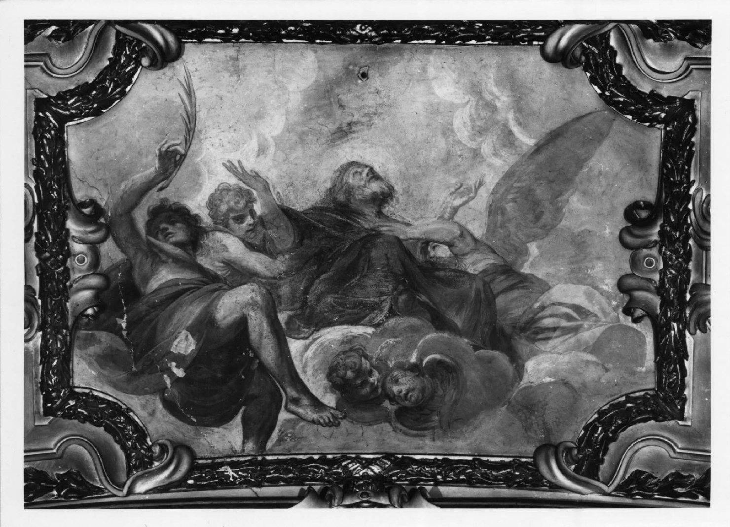 Entro tre cornici in stucco rilevate e dorate, a grossa ghirlanda continua con decori angolari di cornucopie e testine d'angeli alati al centro