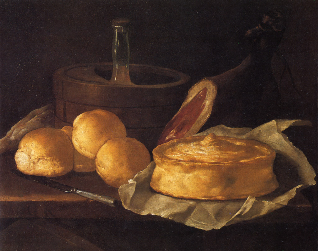 Natura morta con pani, torta (pasticcio) e ghiacciaia