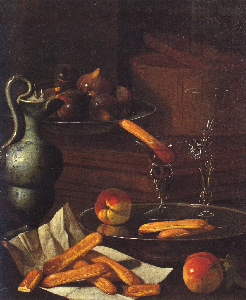 Oggetti: ghiacciaia; vaso; vassoi; bicchieri; biscotti. Frutti: fichi; pesche