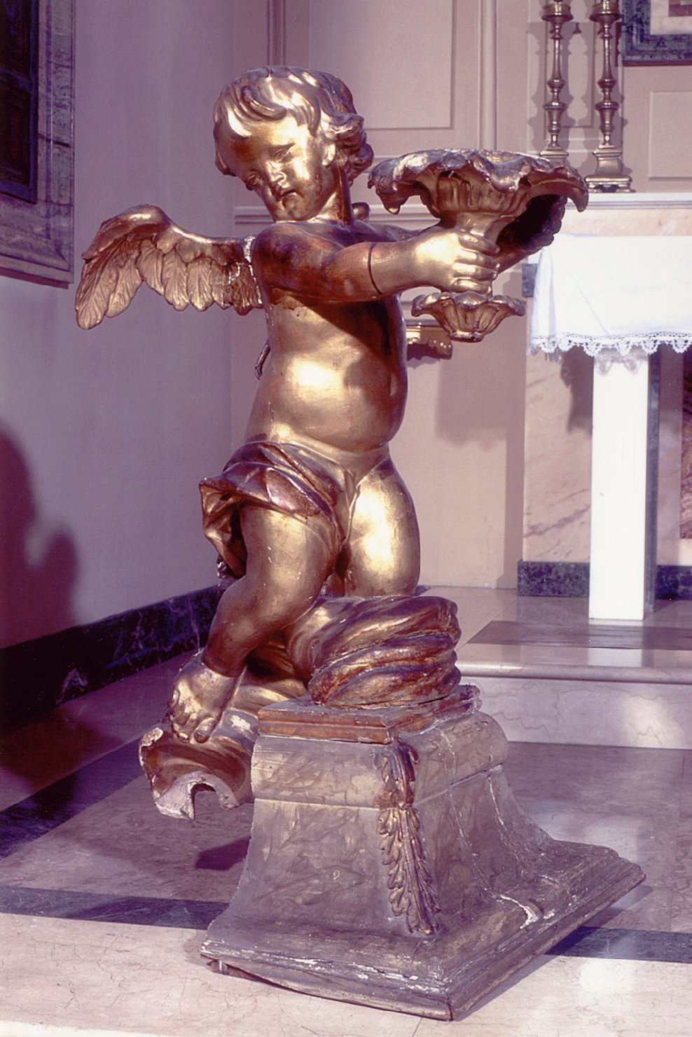 In ginocchio su una piccola base in legno marmorizzato, gli angioletti reggono la base di un candeliere