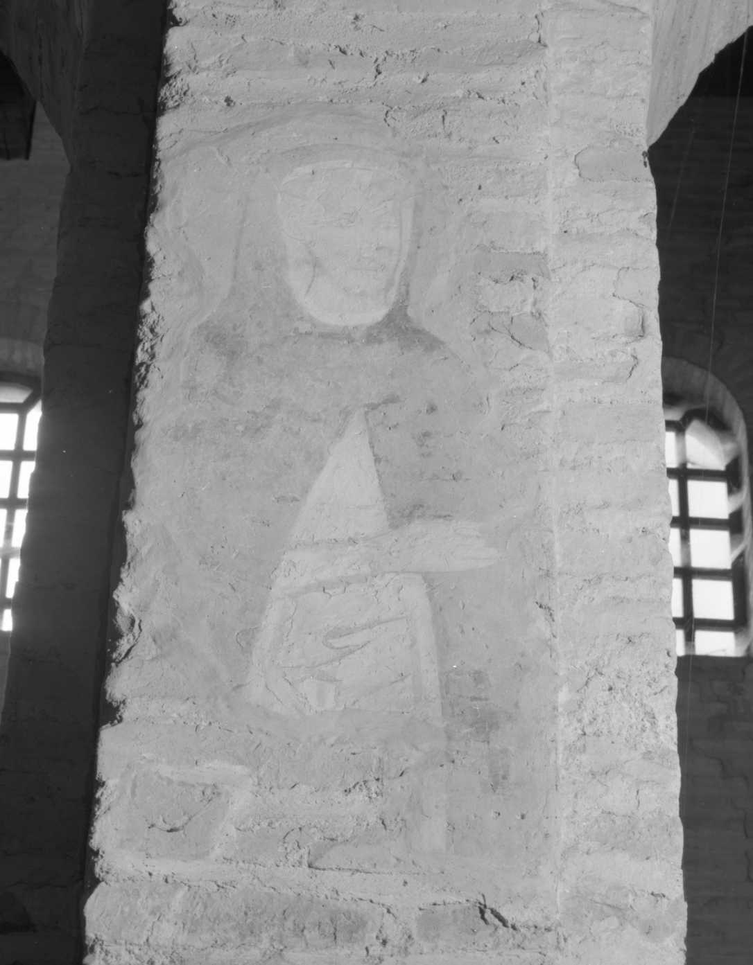 Frammento di affresco con parte superiore di una figura, in piedi, rappresentante un Santo in tonaca bianca e saio nero, cioè un domenicano. Il saio gli incappuccia il capo