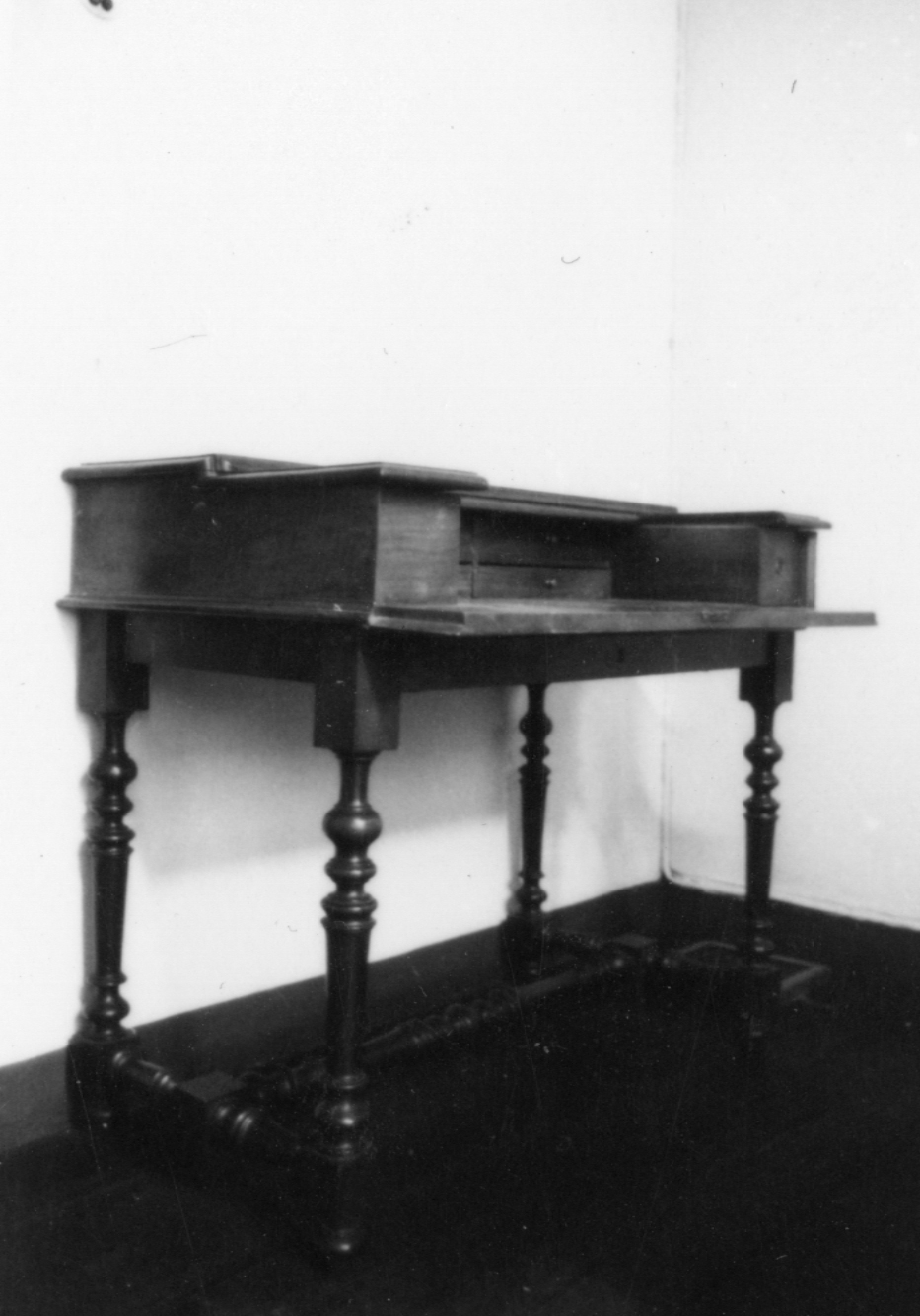 Chiusa sembra un tavolino con alta fascia, poggiante su quattro piedi torniti, raccordati da traverse pure tornite. La parte anteriore si apre a ribalta, mentre nella parte posteriore e nei fianchi sono inseriti quattro cassettini, di frone, e due di fianco