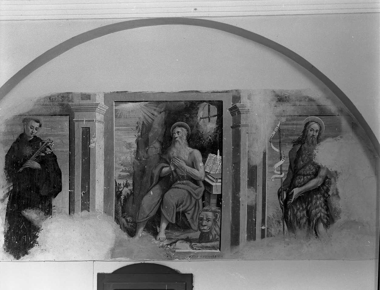L'affresco, inserito nella parte alta di uan niccia muraria rifinita ad arco ed esterna alla cella campanaria, si sviluppa in orrizontale presentando da sinistra San Giovanni Battista, San Girolamo e San Nicola da Tolentino, tutti corredati degli attributi. I santi, posti in piedi sono separati tra loro da lesene architettoniche dipinte. La parte centrale con San Girolamo seduto nella grotta ed il leone ai suoi piedi ha uno sfondo paesaggistico