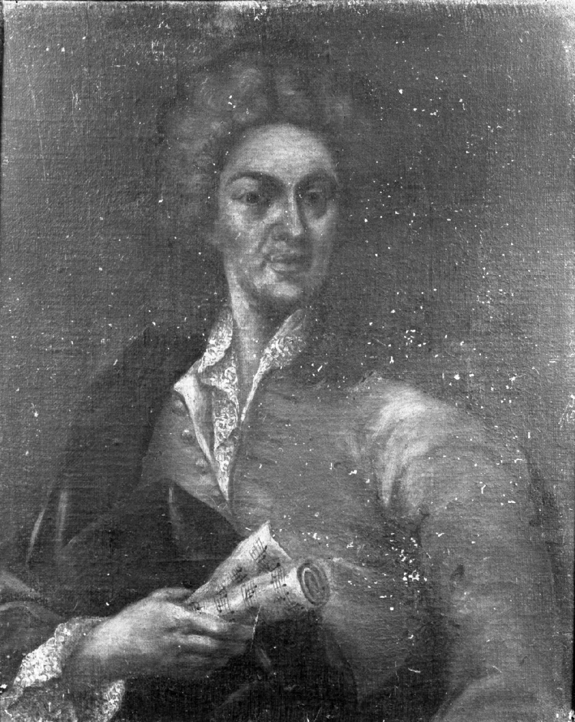 Il personaggio è ritratto fino alla vita; tiene nella destra uno spartito musicale arrotolato e porta sulla spalla destra una sorta di mantello che scende come un drappo fin sul davanti. La giacca aperta lascia vedere una camicia di pizzo. Porta una lunga parrucca. La cornice è dipinta di nero, con i bordi dorati