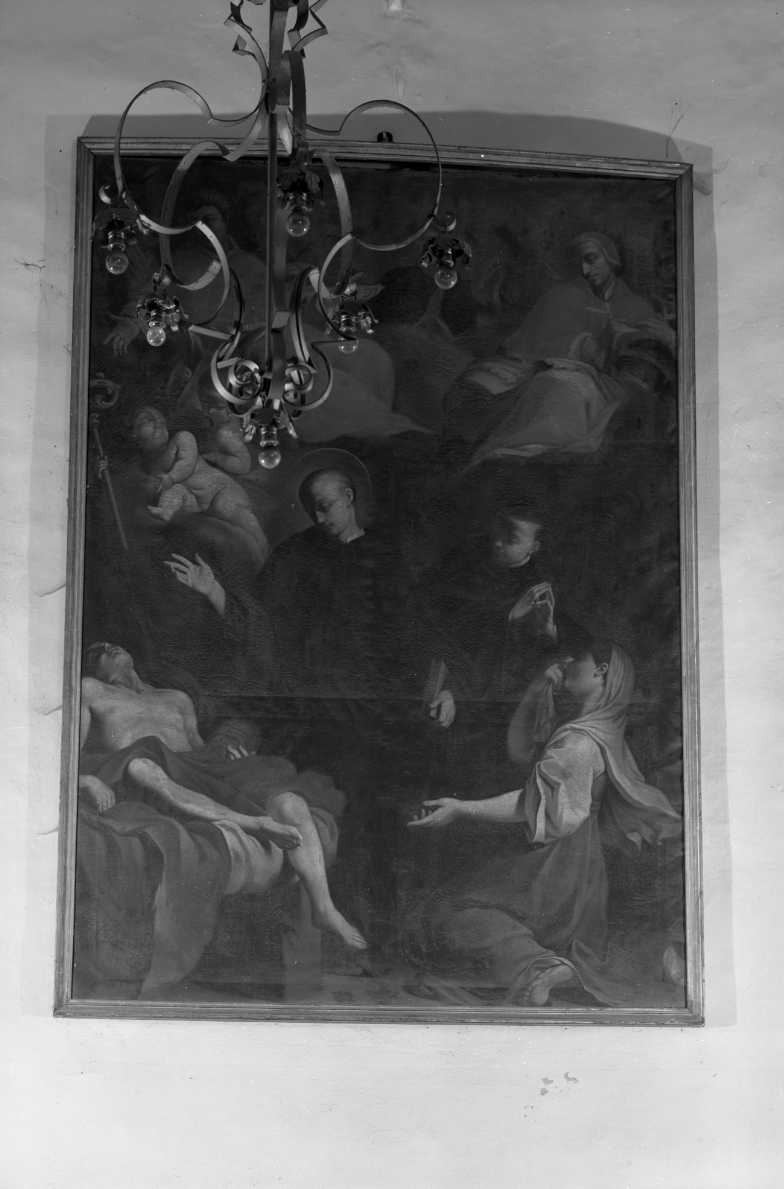 Al centro il Santo in abiti monacali, aiutato da un fraticello che, a mani giunte, lo sta osservando, presta la sua assistenza a un appestato riverso sopra un giaciglio, mezzo ignudo. A destra è inginocchiata una donna in lunga veste grigio - verdastra e manto bianco che lacrima contrita. In alto, seduti sopra nubi, appaiono sette Pontefici. A sinistra due putti reggono un pastorale. Cornice ottocentesca dorata
