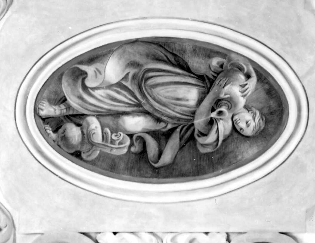 Entro i sette ovali posti in senso longitudinale, intercalati con quelli rappresentanti i santi titolari della chiesa, sono raffigurate a monocromo le virtu cardinali e teologali secondo questa successione: Fortezza, Temperanza, Prudenza, Carità, Speranza, Fede, come figure femminili erette accompagnate dagli attributi che le rendono riconoscibili