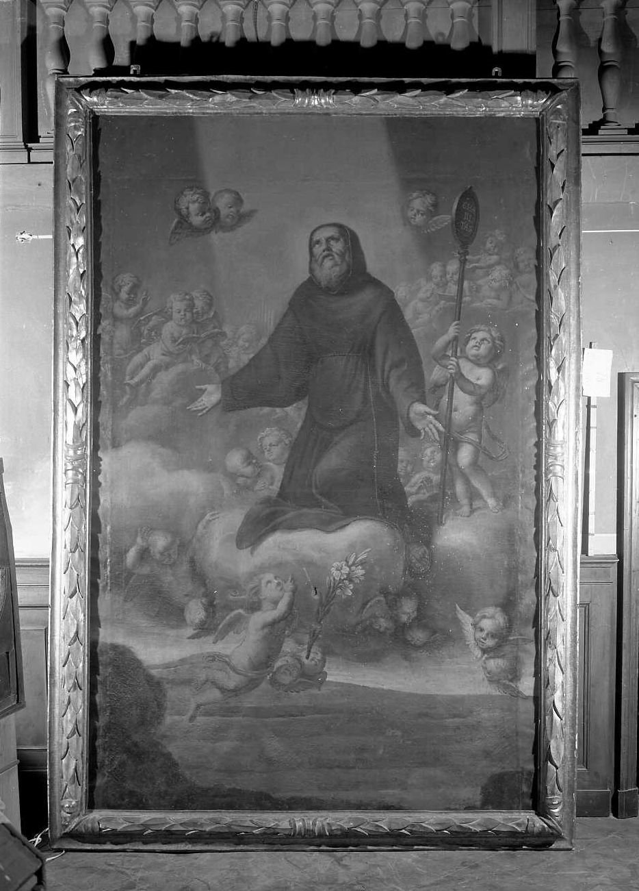 Al centro inginocchiato su nubi il Santo è investito da un raggio luminoso. Gli fanno corona serafini e angioletti, dei quali uno alla sua sinistra regge uno scudetto, e uno in basso reca un gliglio. In basso, sullo sfondo, un paesaggio collinare