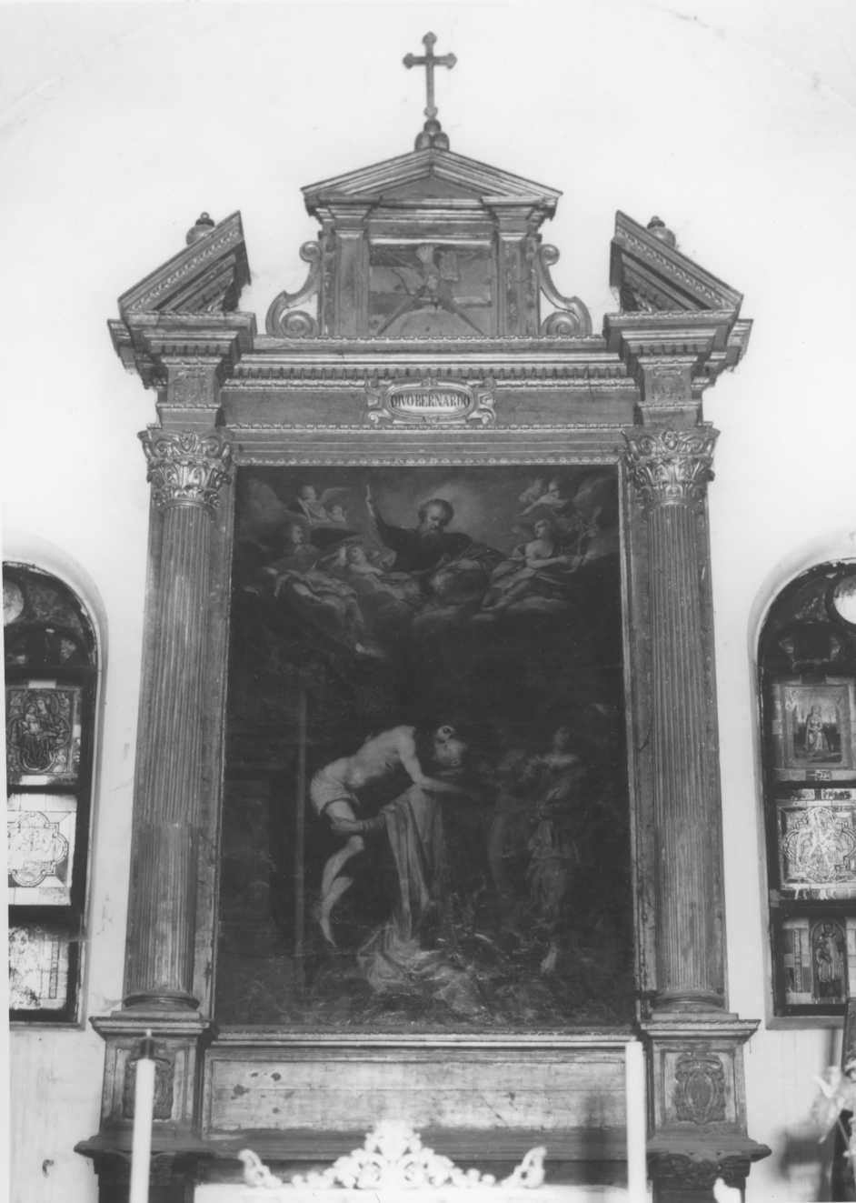 - NOTIZIE STORICO CRITICHE La chiesa fu costruita, in onire di S. Bernardo, tra il 1645 e il 1673; l'ancona e dunque anche la pala d'altare risalgono a questo momento. I nomi dell'intagliatore e del doratore risultano dalle note di spese dell'Archivio Vescovile alle date del 9 settembre 1673 e 11 maggio 1675
