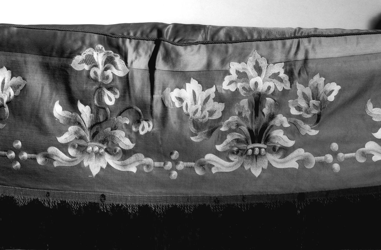 Grandi drappi rossi ricamati a punto pittura secondo un motivo continuo e regolare di grandi foglie gialle dalle quali escono gruppi di tre fiori o un singolo fiore con bocciolo e foglie verdi, alternati. Una losanga a quattro palline raccorda le foglie. Le corolle sono riempite da retino d'argento. Frangia di seta con nappe