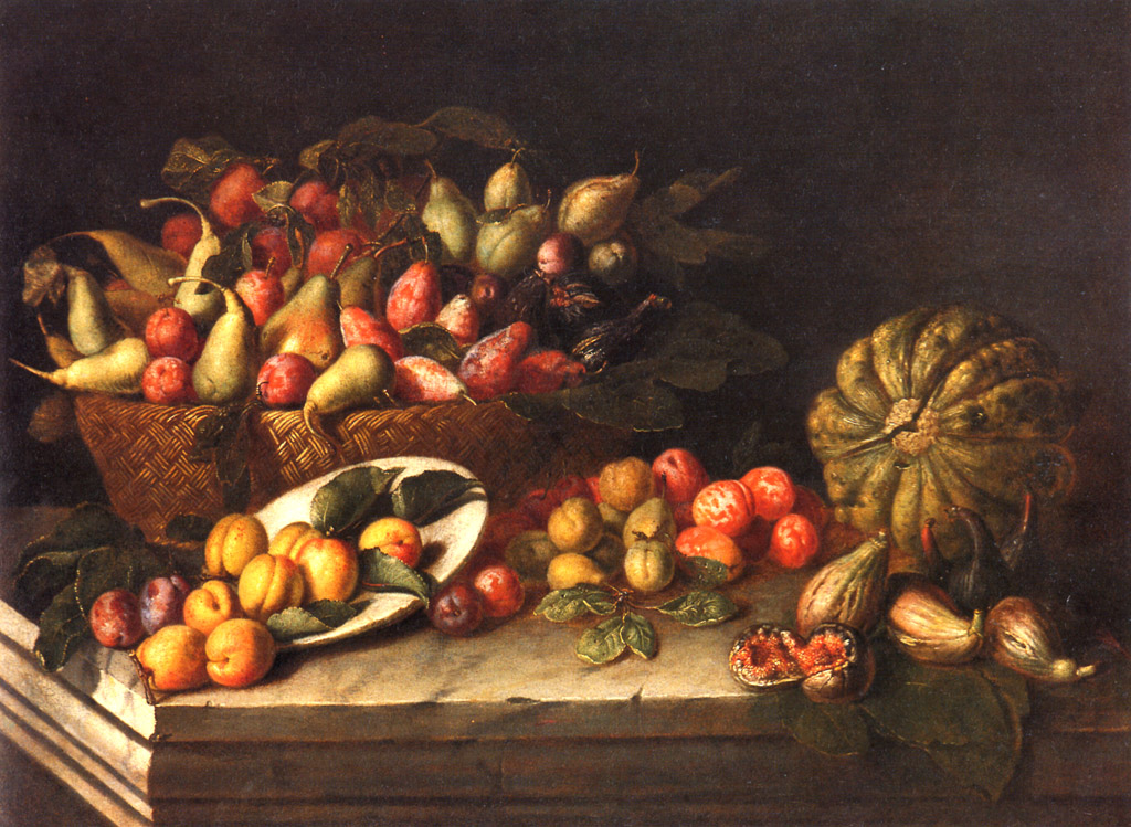 Frutti: pere; prugne; albicocche; fichi; melone. Oggetti: cesta; tavolo