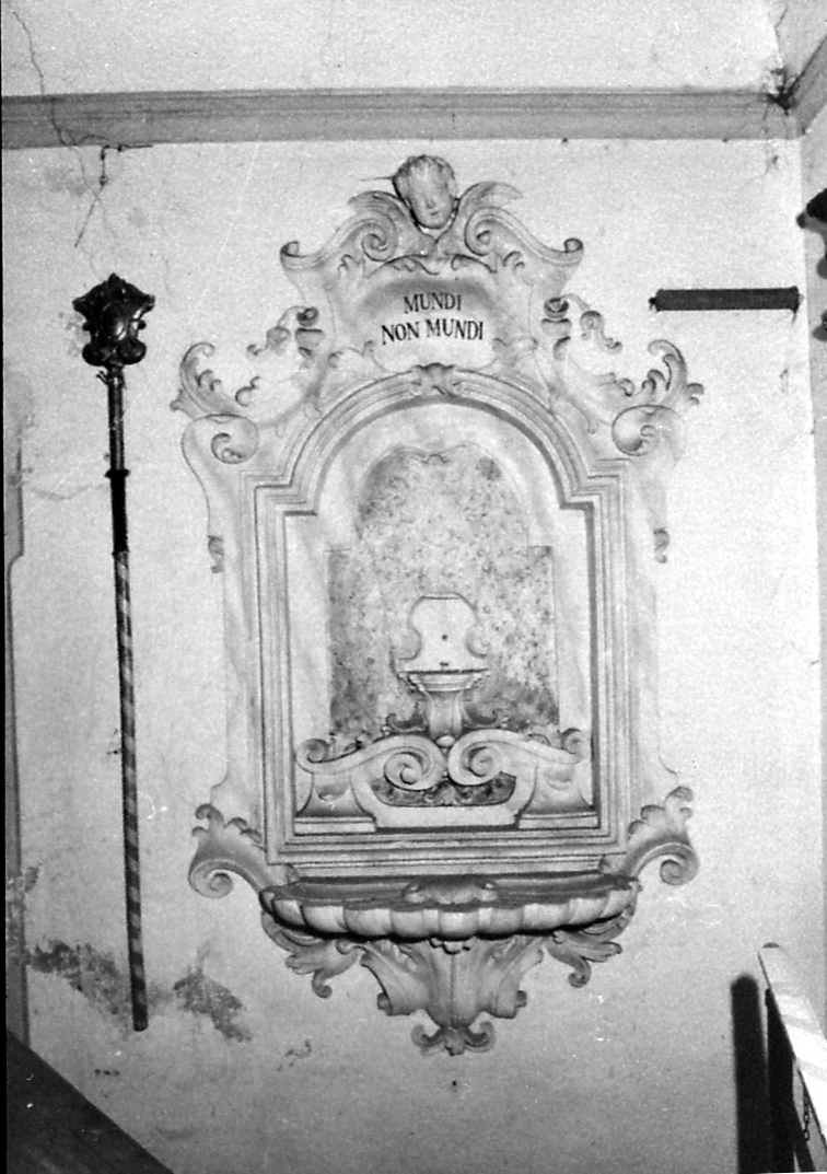Il lavabo è a forma di conchiglia di pietra scolpita; la cornice sul muro è dipinta con sagomatura in alto e decorazioni fitomorfe in stucco che culminano in alto con una testa di cherubino; all'interno dell'incorniciatura la lavorazione a scagliola imita le venature del legno