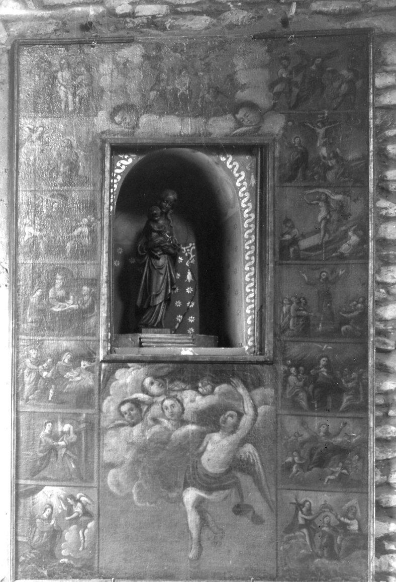 La tela circonda una nicchia con statuetta della Madonna del Rosario