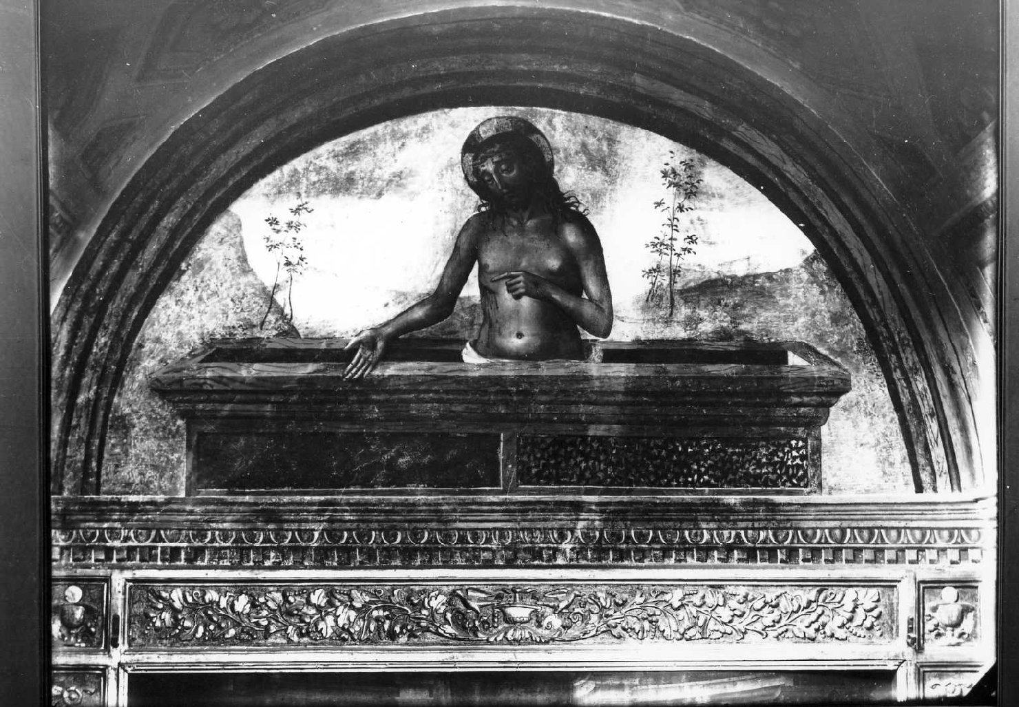 Il Cristo a mezzo busto, sorgente dal sepolcro. Con la mano sinistra indica la ferita al costato. Sullo sfondo è un paesaggio brullo