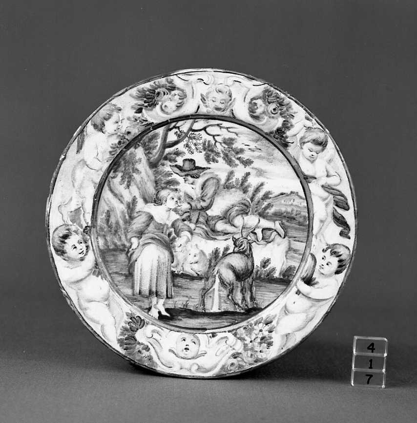 Piatto apodo acon cavetto appena accennato e breve tesa lievemente obliqua. Idillio pastorale, sulla tesa cornice di quattro putti e cartelle rococò, con teste alate e mazzi fioriti. Colori: giallo, arancio, marrone, verde, blu, azzurro su fondo biancastro