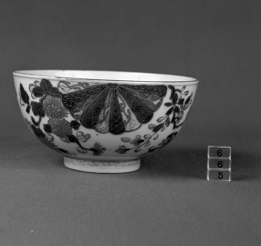Ciotola emisferica alta su piede cilindrico. Sulla parete esterna due ventagli alternati a rami fioriti, al centro rosone con girale di foglie e fiori; nell'incavo del piede rametto fiorito entro due filetti. Colori: blu, rosso mattone, arancio, rosa, verde e oro su fondo biancastro