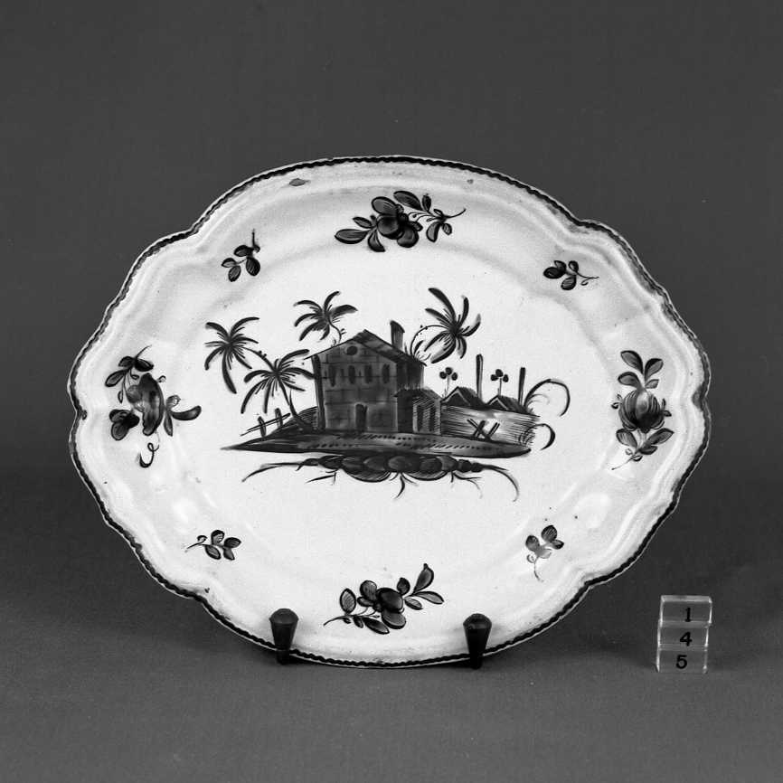 Vassoio apodo, sagomato, con cavetto sagomato e bordo svasato. Colori: nero e verde comerio su fondo biancastro. Alla base marca " chiave n. 1" in verde. Casetta, capanne e palme al centro; sulla tesa quattro rami fioriti alternati a quattro gruppi di foglie
