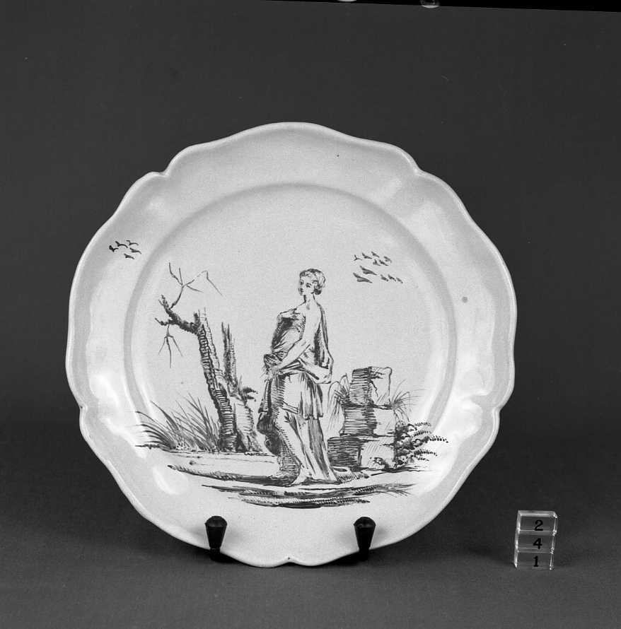 Piatto con tesa sagomata e obliqua; apodo. Paesaggio, figura femminile, roccia, albero, due gruppi di uccelli in volo. Colori: rosso mattone su fondo biancastro