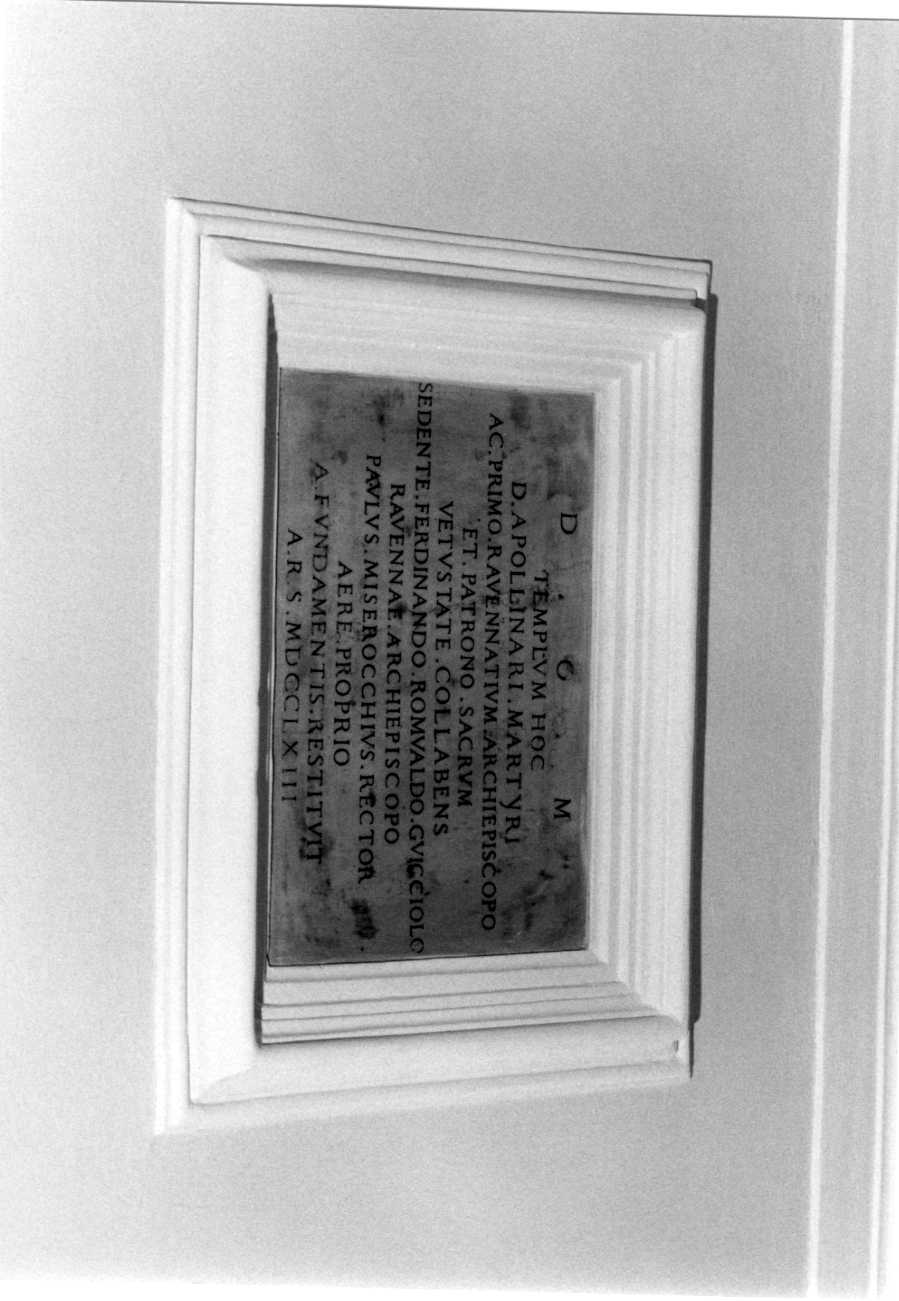 - ISCRIZIONI A tutto campo - D.O.M./ TEMPLUM HOC/ D. APOLLINARI MARTYRI/ AC PRIMO RAVENNATIUM ARCHIEPISCOPO/ ET PATRONO SACRUM/ VETUSTATE COLLABENS/ SEDENTE FERDINANDO ROMUALDO GUICCIOLO RAVENNAE ARCHIEPISCOPO / PAULUS MISEROCCHIUS RECTOR/ AERE PROPRIO/ A FUNDAMENTIS RESTITUIT/ A. R. S. MDCCLXIII - lettere capitali -