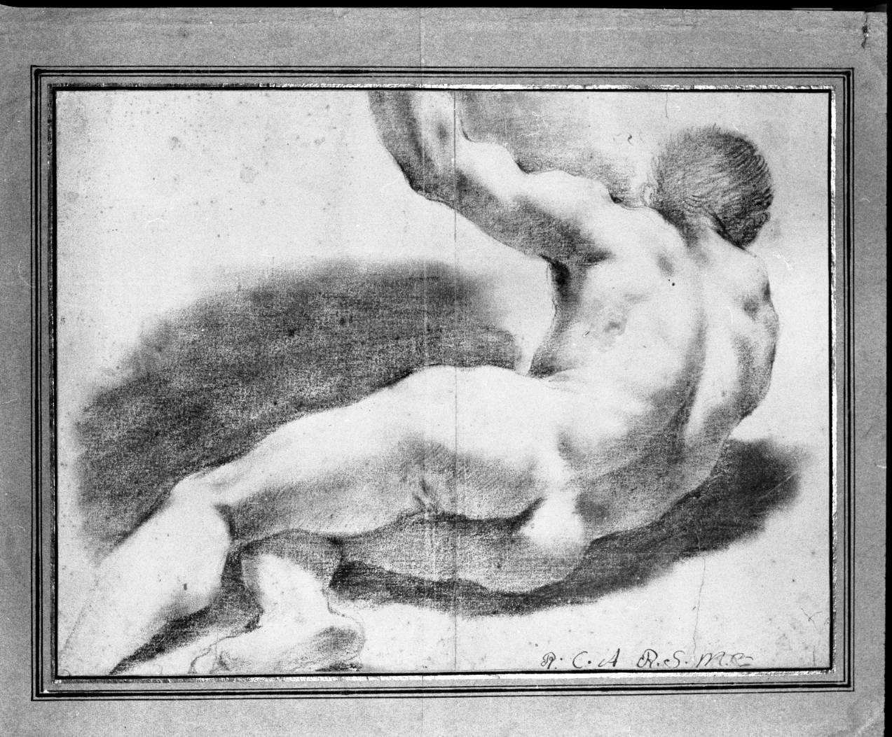studio di nudo maschile sdraiato visto da tergo, col braccio sinistro alzato