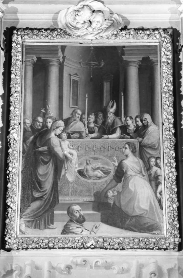 La scena si svolge davanti all'altare di un tempio dalle forme classicheggianti, evidenziate dalla doppia serie di colonne doriche sullo sfondo. La Madonna avanza da sinistra recando il Bambino in braccio. Da destra una figura femminile porge il canestro con la coppia di colombe, offerte per la purificazione. Attorno vari personaggi: a sinistra San Domenico con il giglio, al centro il sommo sacerdote. In primo piano un confratello con la cappa bianca recante il simbolo della confraternita, è rivolto verso gli spettatori