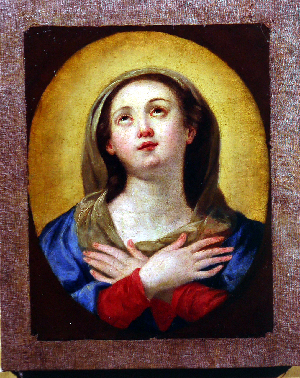 Mezzo busto della Vergine con le mani incrociate sul petto, maniche rosse, mantello blu sulle spalle e velo beige