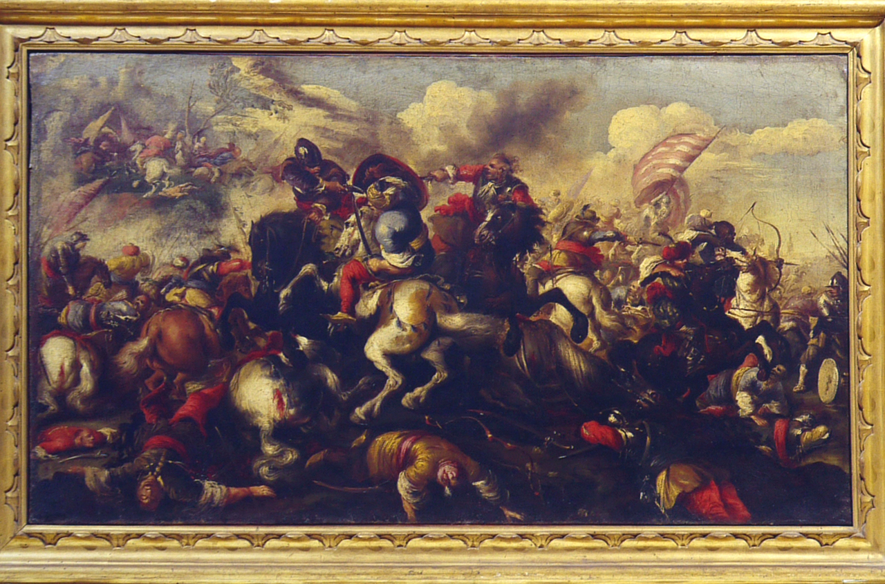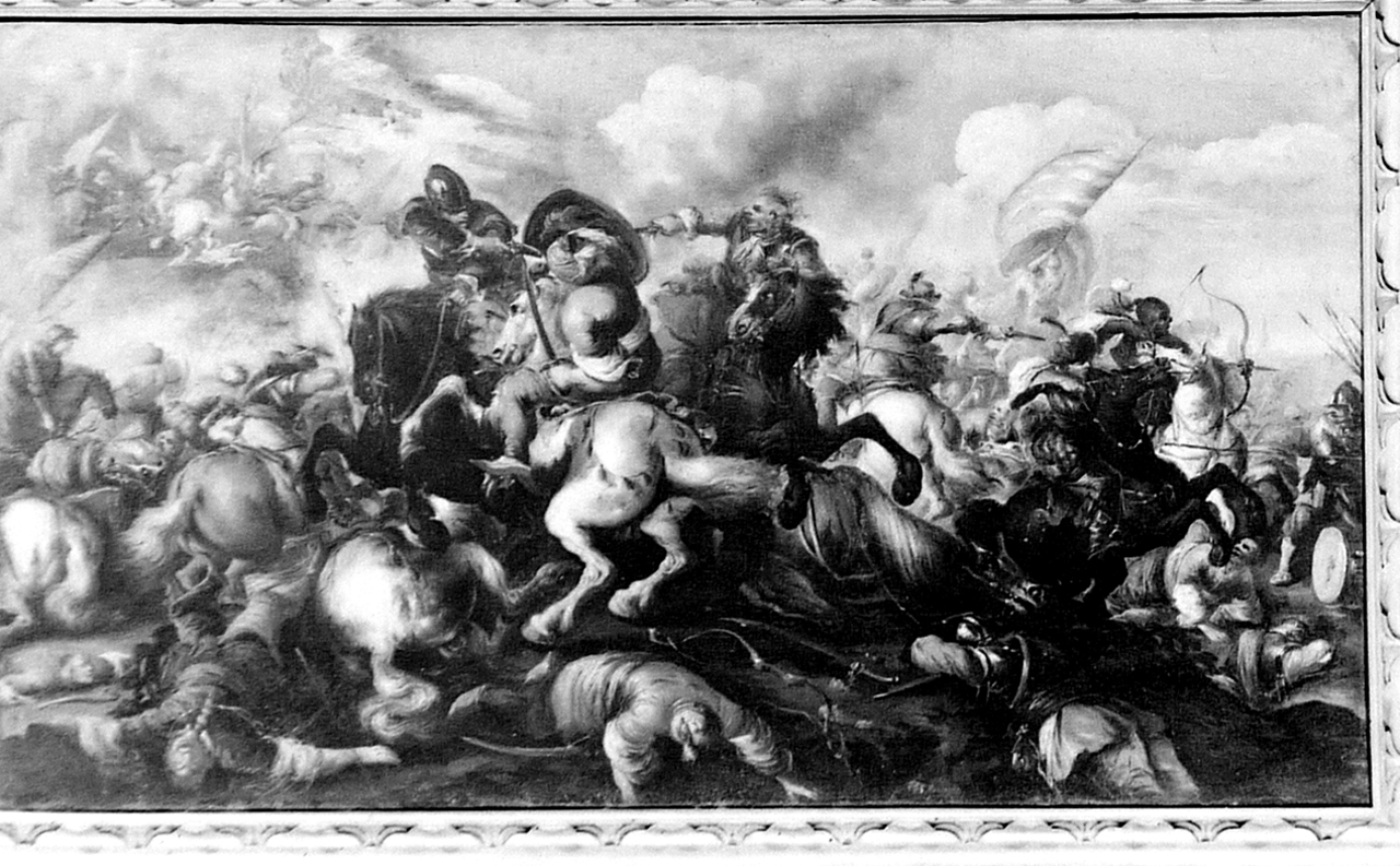 - NOTIZIE STORICO CRITICHE Il Buscaroli ritiene che l'opera potrebbe essere stata realizzata dal Courtois intorno al 1680. Patrizi invece assegna l'opera alla scuola veneta del Settecento, molto vicino a Francesco Guardi. Nell'inventario Scarani sono segnalate altre battaglie, una delle quali "di maniera del Calza", pittore che fu allievo del Cignani nei primissimi anni di attività. L'attribuzione al Calza rimane la più probabile, anche se è preferibile lasciare un ampio margine di incertezza e situare l'opera nel catalogo di un artista a lui vicino