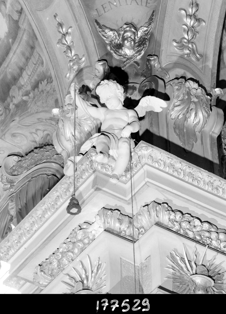 Coppia di angioletti che reggono la corda delle lampade, seduti sul bordo degli angoli sinistro e destro del cornicione del presbiterio