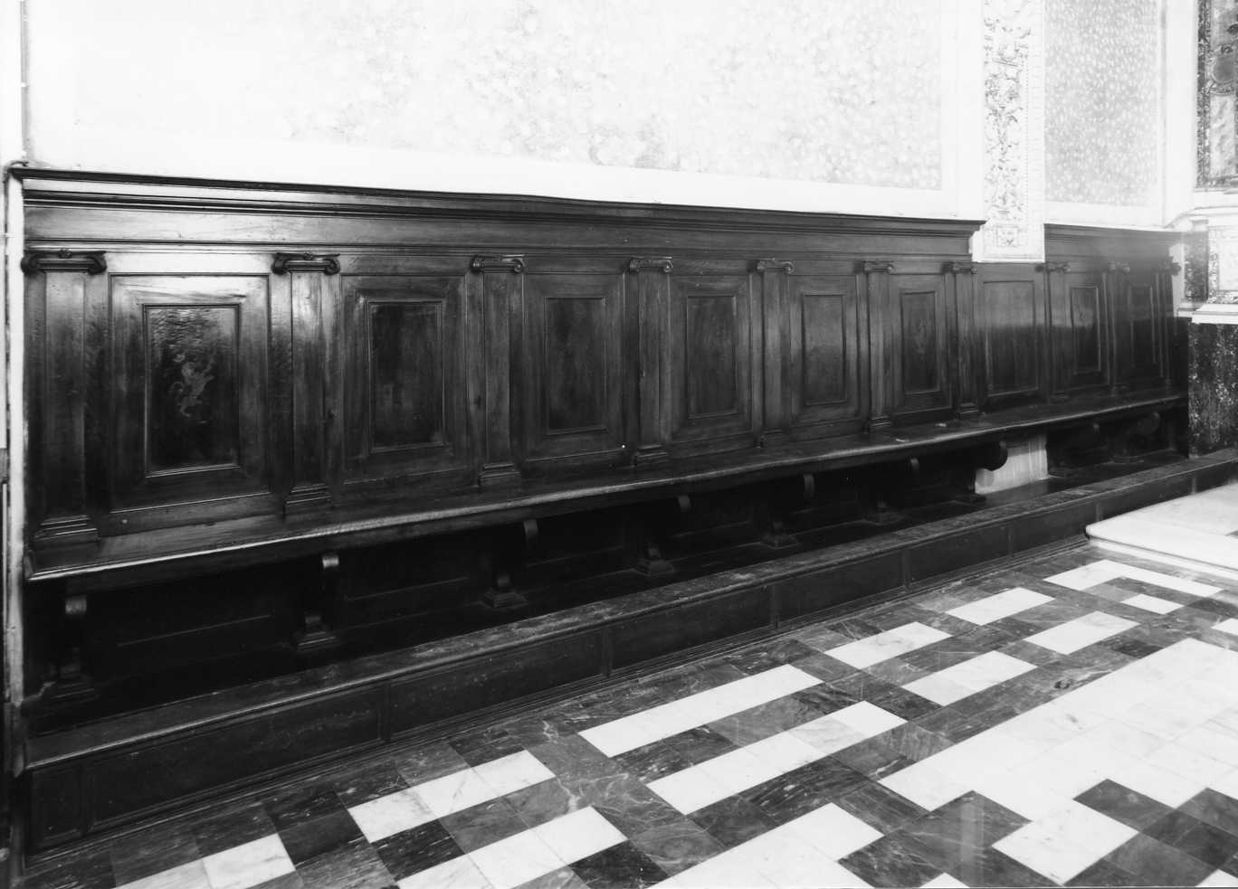 Coro composto su entrambe le parti da un sedile continuo e da un dossale continuo suddiviso in otto specchi. I dossali primo, sesto, settimo e ottavo, su ogni lato, recano al centro, intarsiato, il leone rampante dello stemma comunale