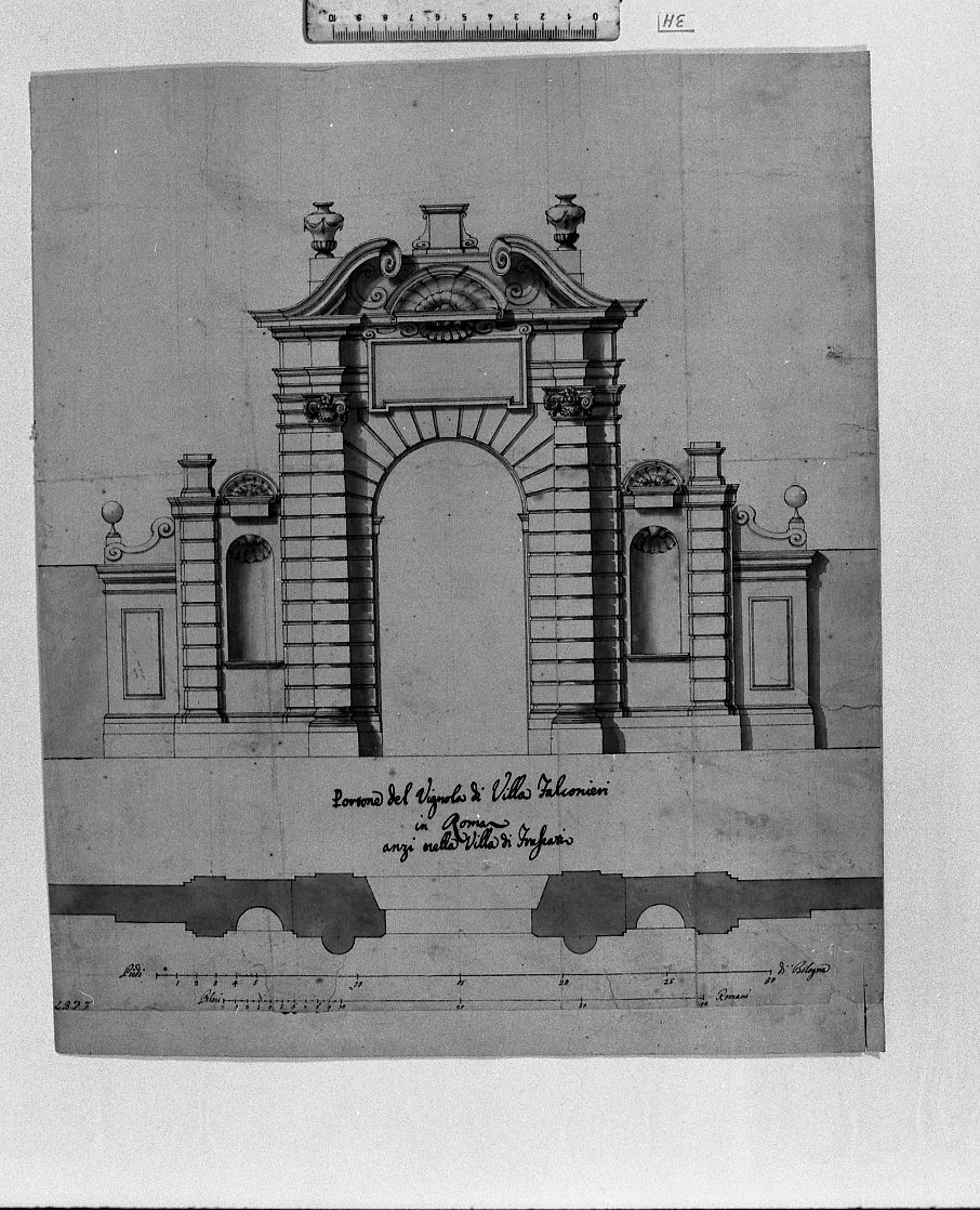 - NOTIZIE STORICO CRITICHE Il disegno riproduce, come suggerisce la didascalia posta successivamente, l'ingresso di villa Tuscolana (Frascati) eseguito dal Vignola. I documenti informano, infatti, che nell'aprile del 1569 l'architetto aveva dato "occhio alla fabbrica et commesso quanto gli occorreva", tanto da far sperare il proprietario in una rapida ristrutturazione dell'antica villa. Il disegnatore, siglandosi con le lettere "L.B.D.F.", allo stato attuale degli studi, resta anonimo, anche se denota di esprimere con notevole capacità grafica, l'ideale ritorno alle cinquecentesche forme romane diffusosi in Bologna sul finire del XVIII secolo