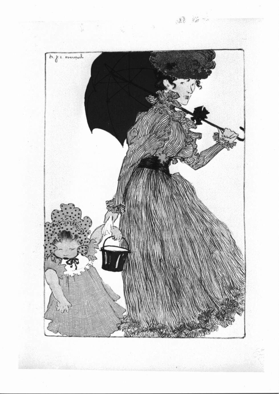 Figure: donna; bambina. Abbigliamento: abiti; cappelli. Oggetti: ombrello; secchiello
